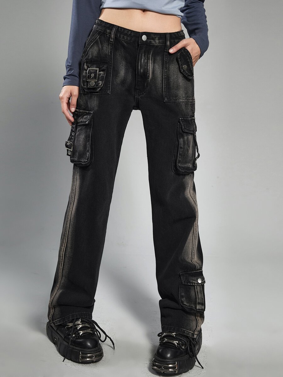 Grunge Punk Jeans cargo con bolsillo con solapa con tira