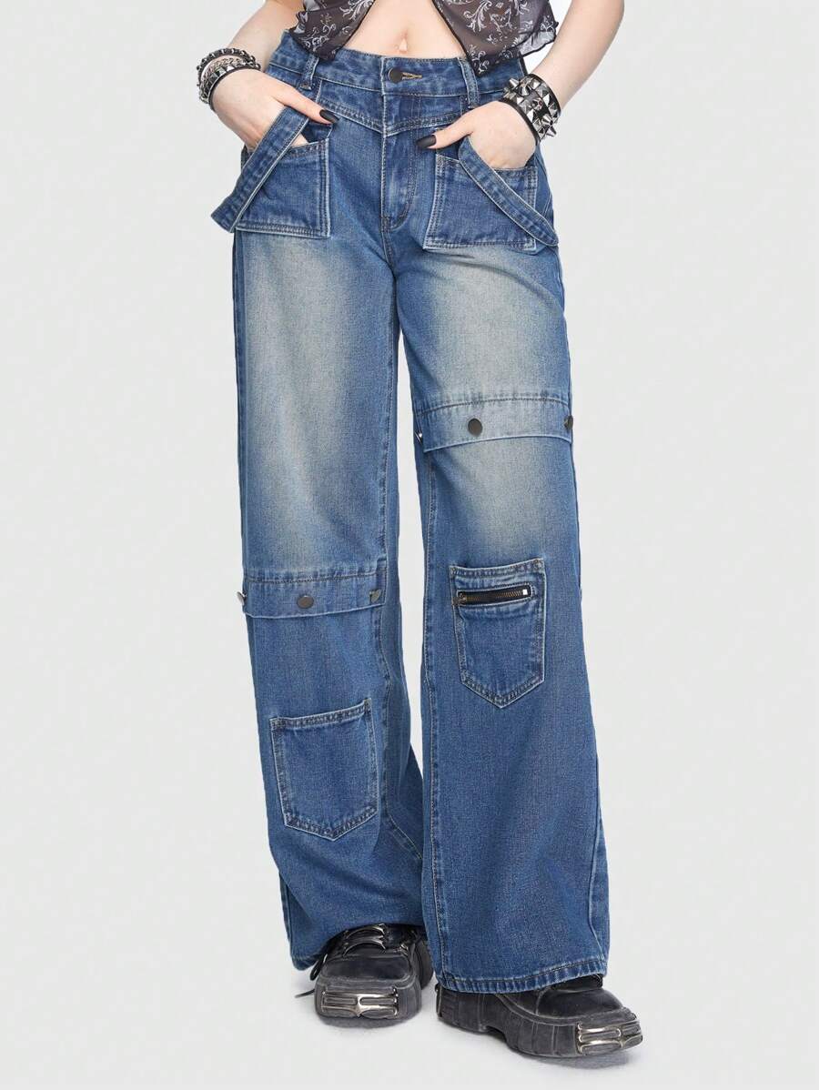 Grunge Punk Jeans De Pierna Ancha Con Bolsillos Con Solapa