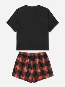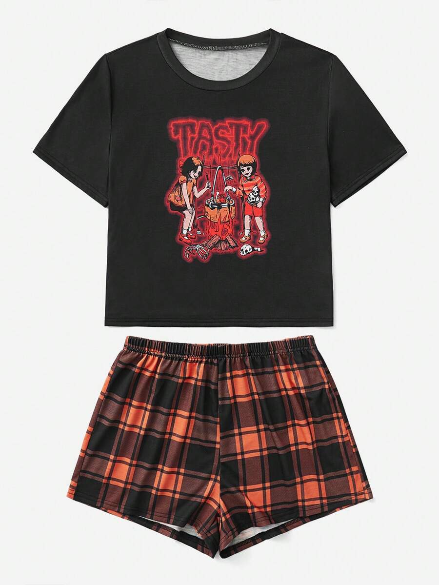 Grunge Punk Conjunto de pijama Camiseta con letra con estampado de dibujos animados & Shorts de cuadros