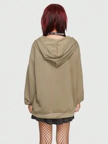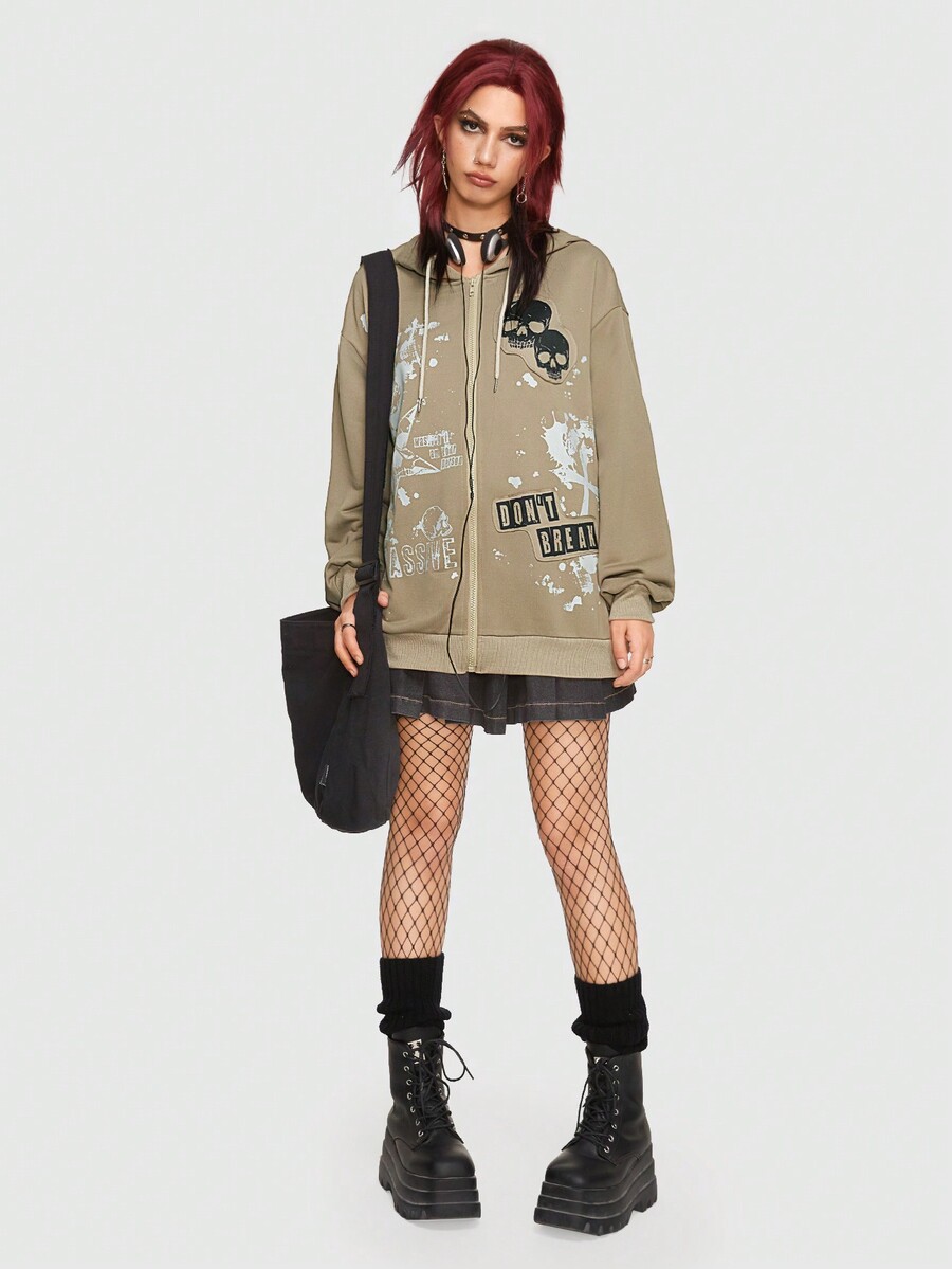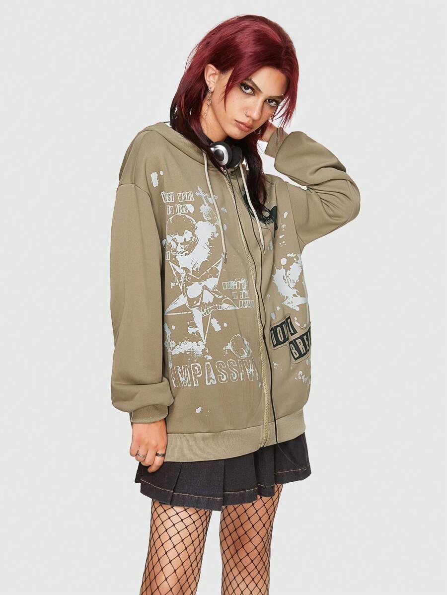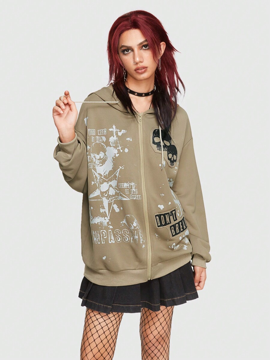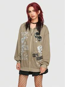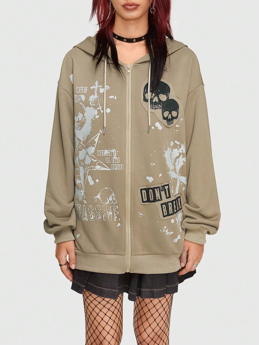 Grunge Punk Capucha con cremallera con letra & con estampado de cráneo