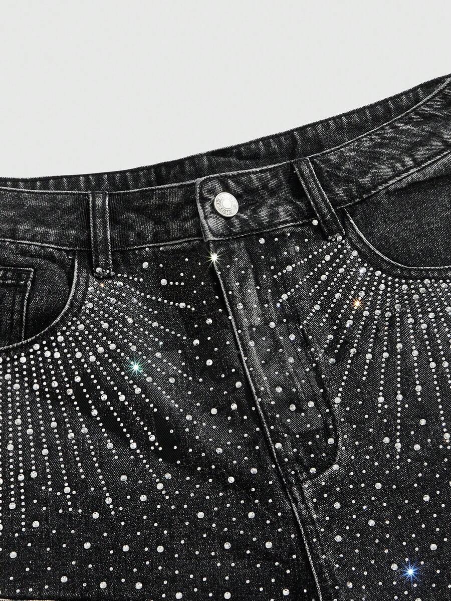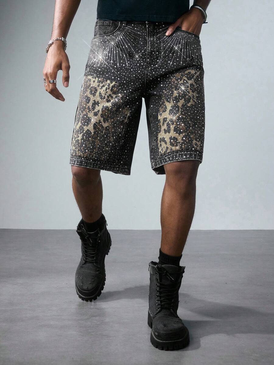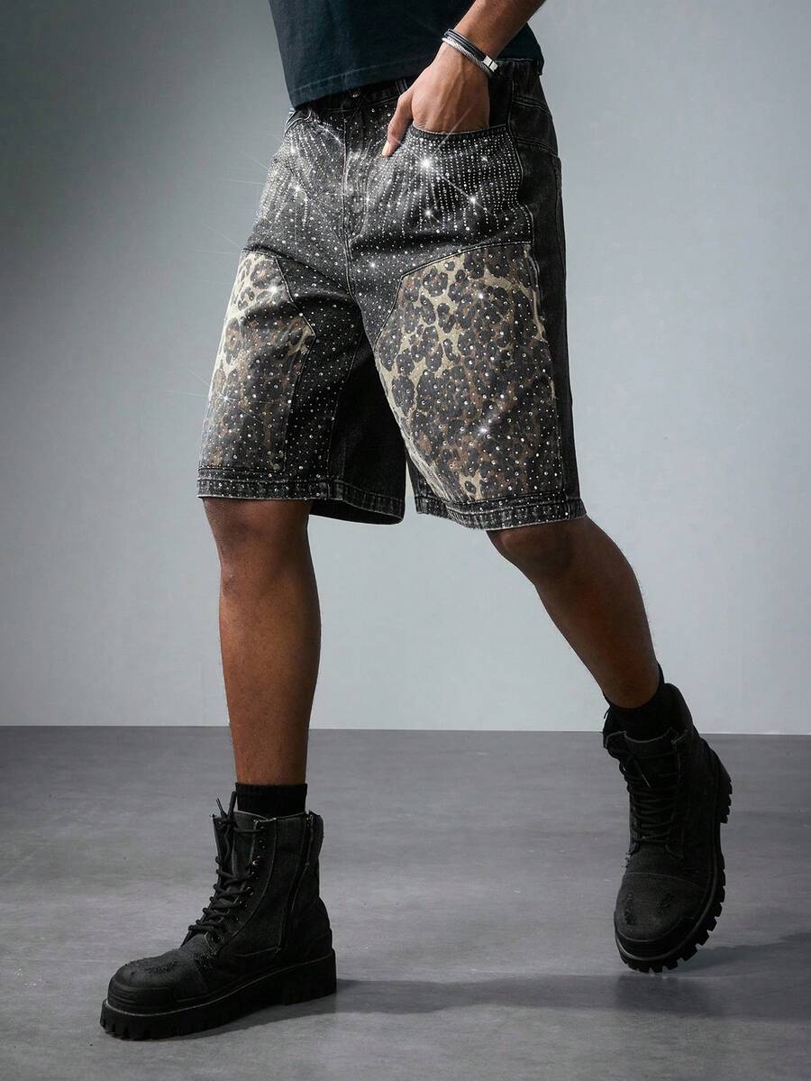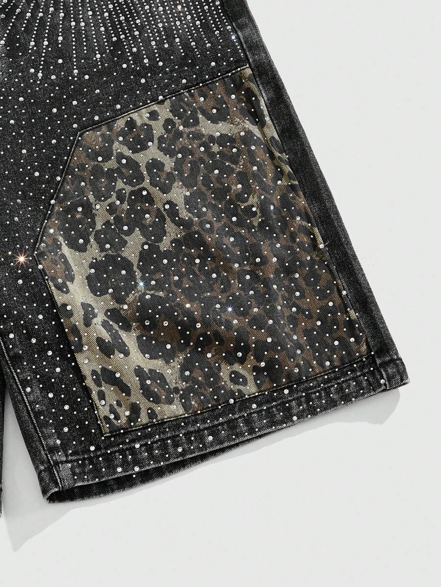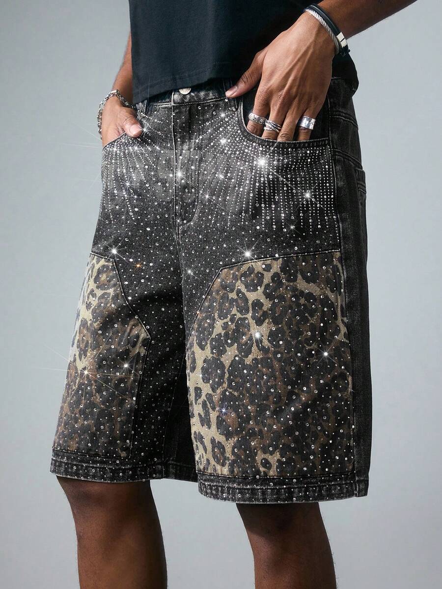 Grunge Punk Shorts de mezclilla con estampado de leopardo y diamantes de imitación para hombre, de moda para el verano