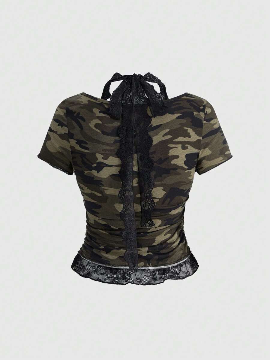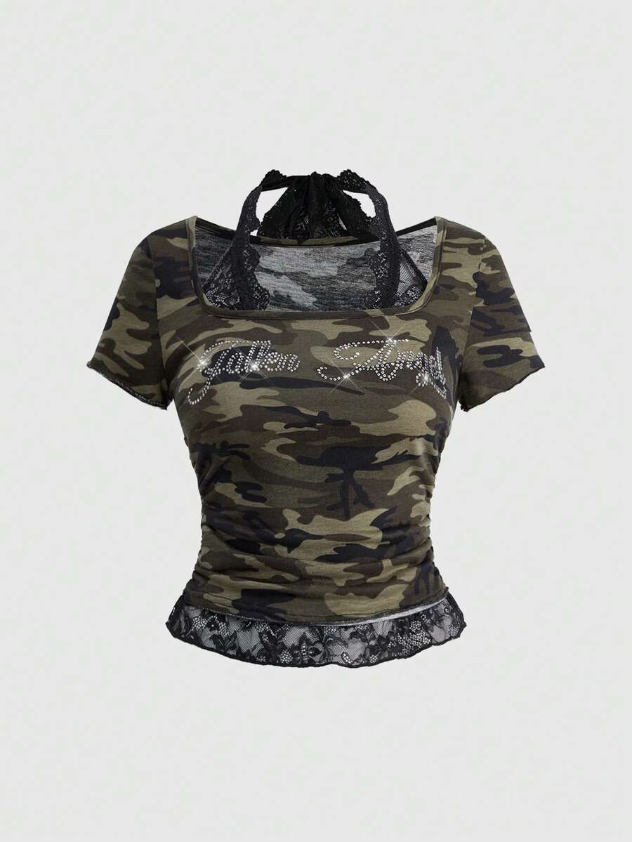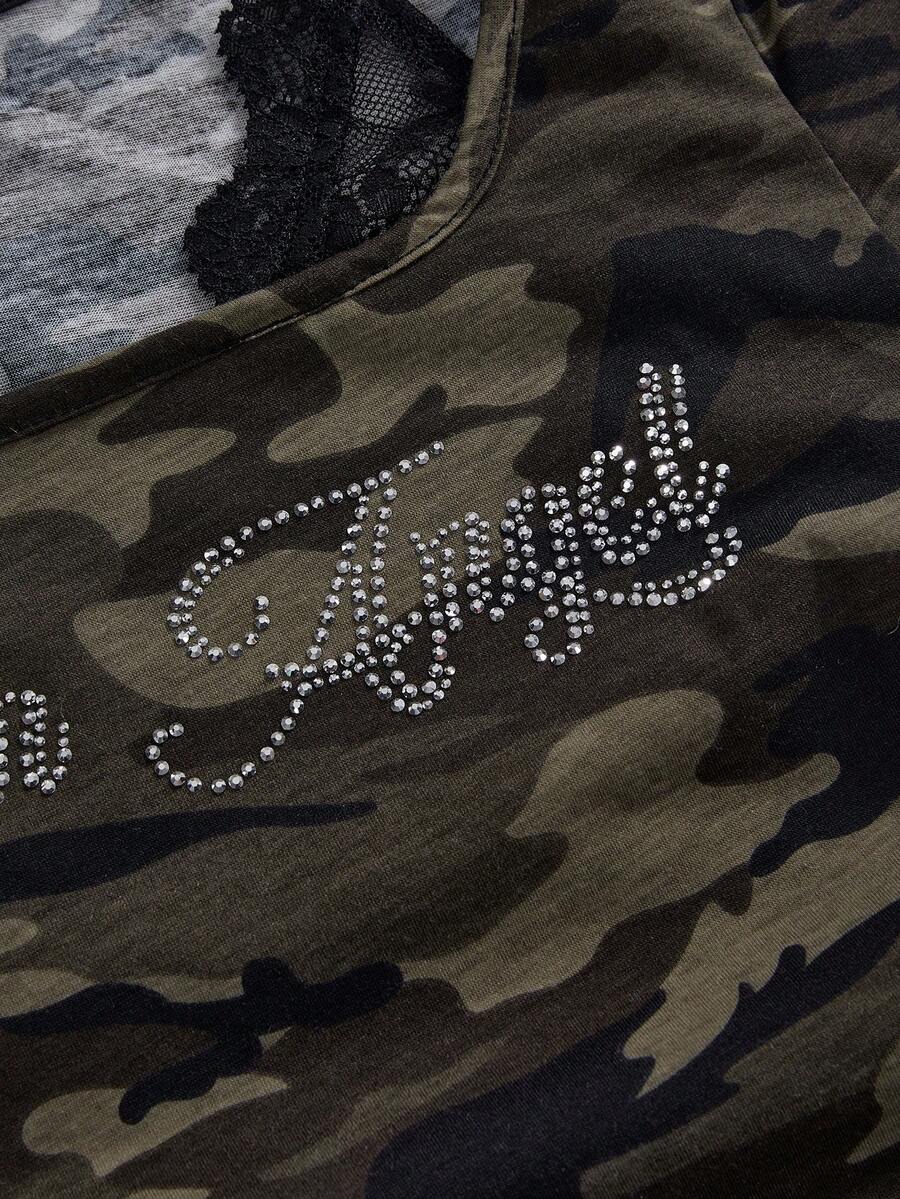 Grunge Punk Camiseta ajustada de mujer con cuello redondo, parches de encaje, camuflaje y aplicaciones de rhinestones con diseño punk