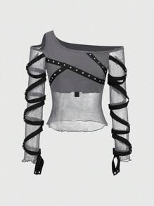 Grunge Punk Camiseta de mujer con hombros recortados, malla con tachuelas, estilo punk rock, para festivales de música, verano