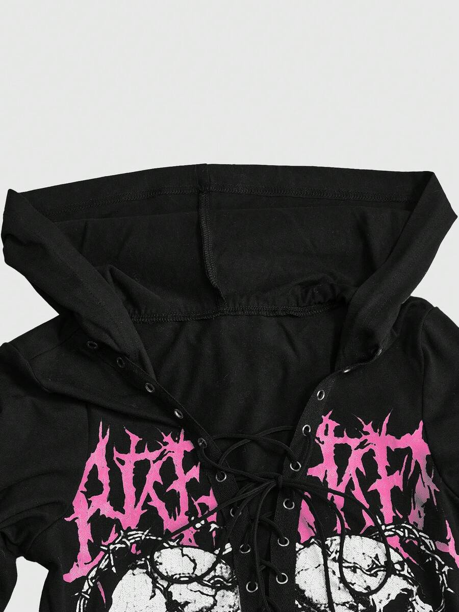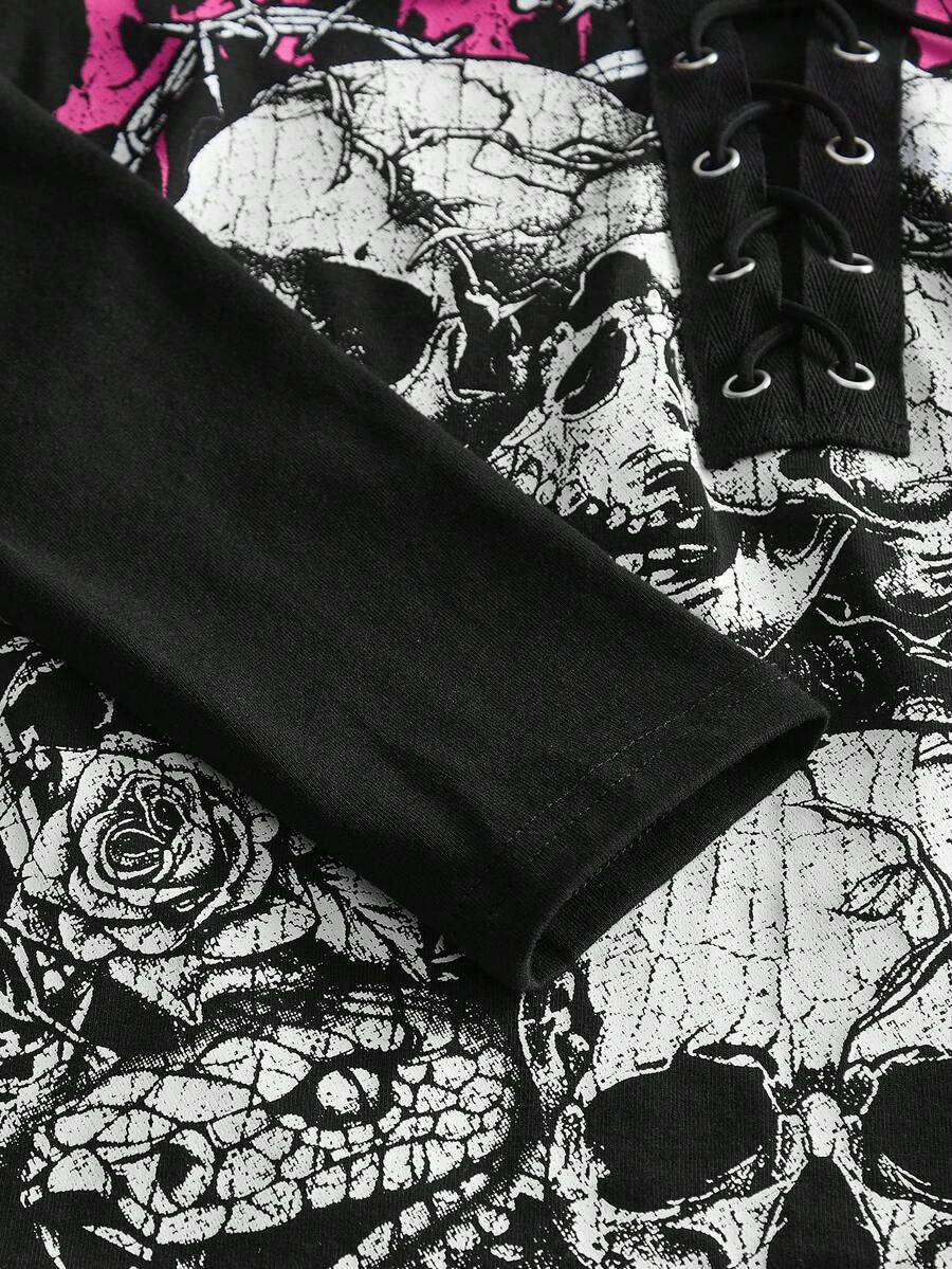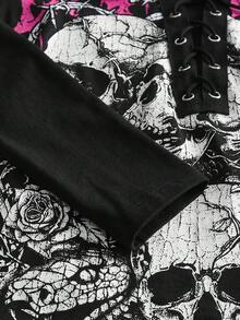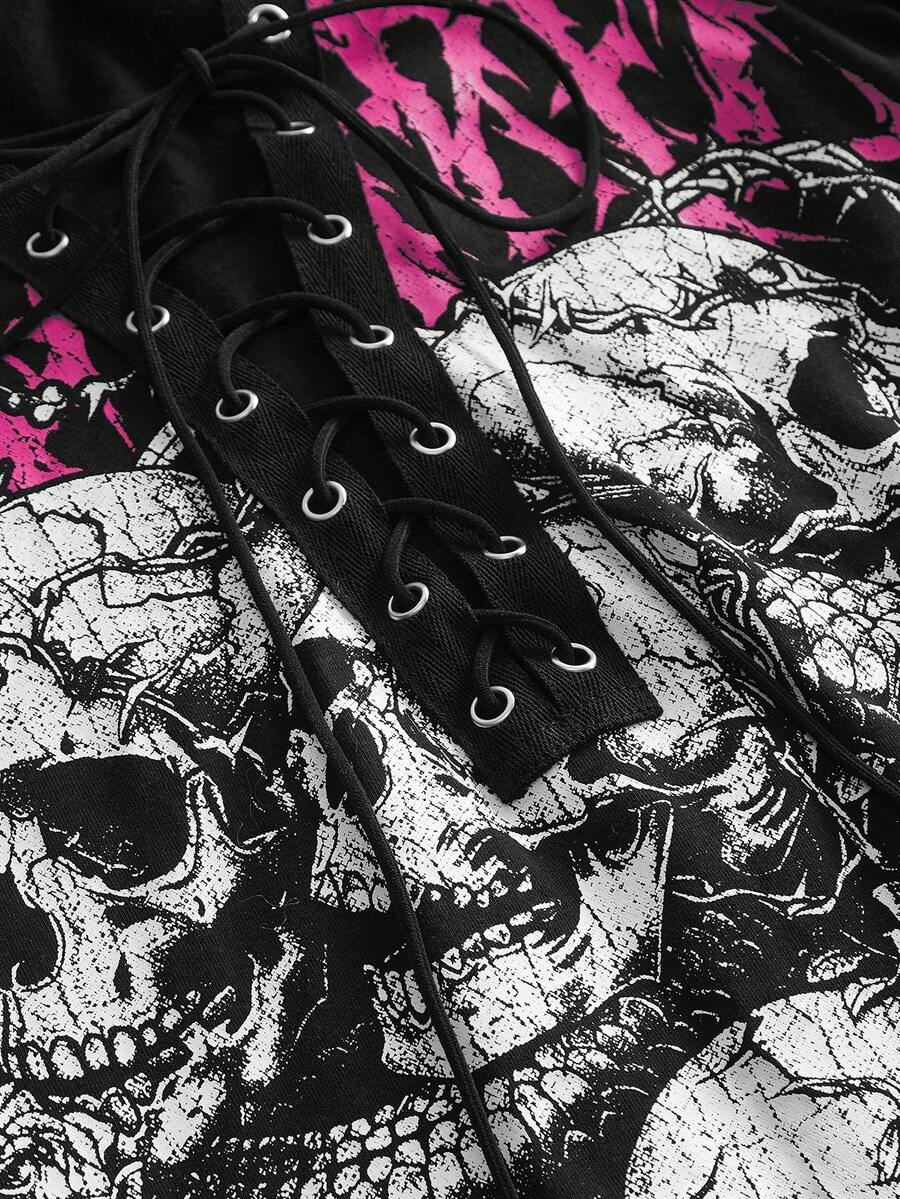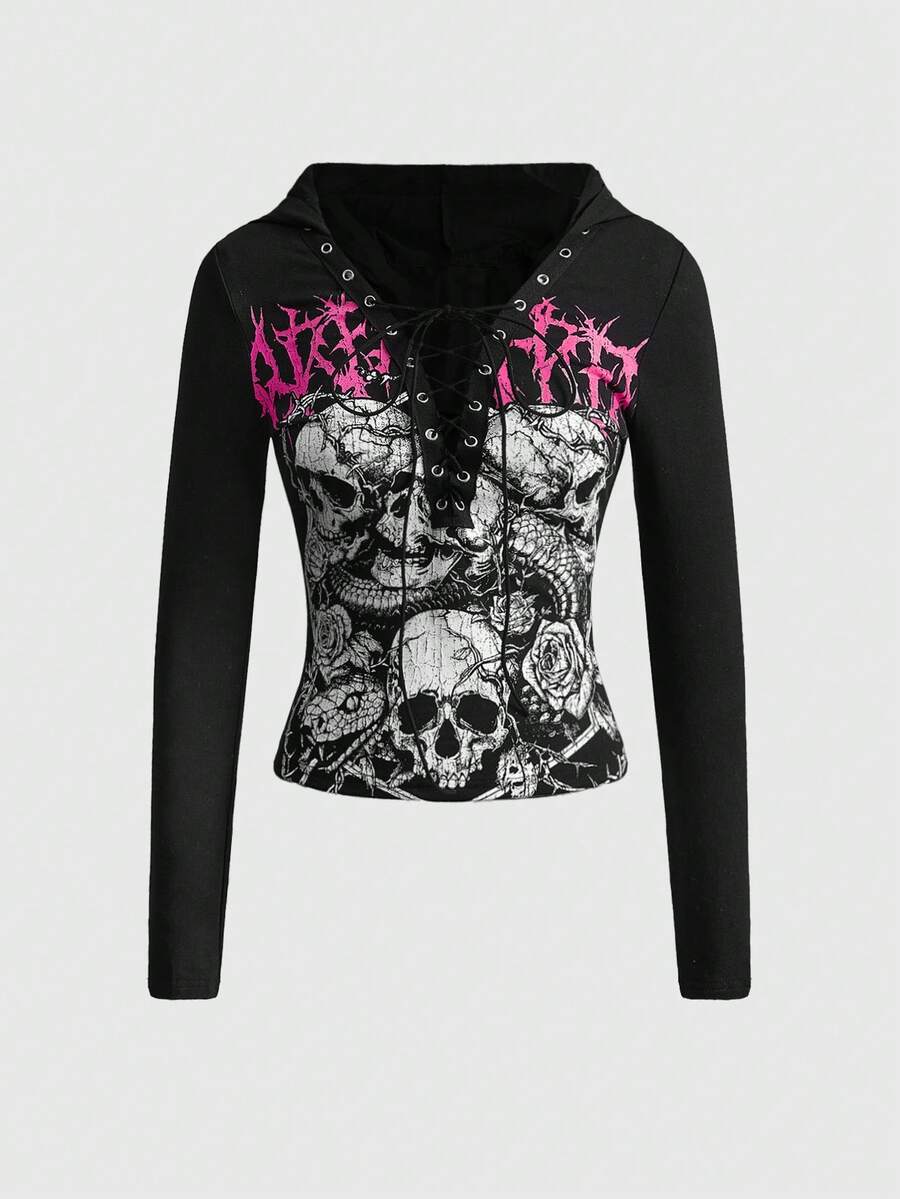 Grunge Punk Camiseta de mujer con cuello en V profundo, estampado de calavera y volantes con lazo al frente, estilo punk
