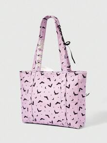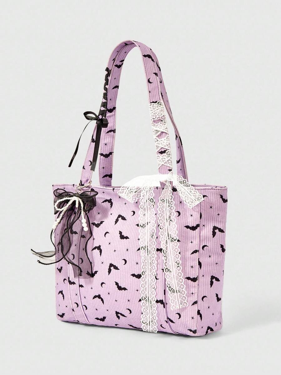 Grunge Punk Bolso de mano grande con estampado de murciélagos morados, estilo gótico, con lazo decorativo, de gran capacidad y portátil para mujer
