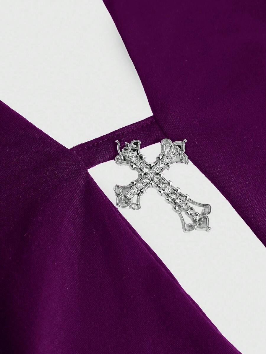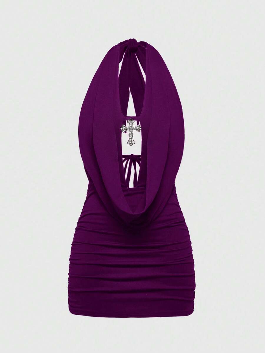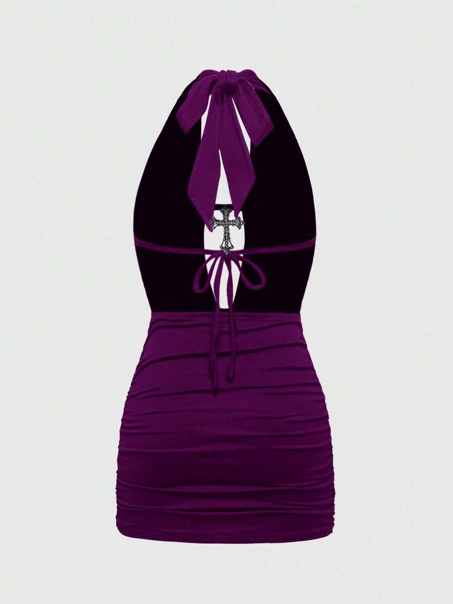 Grunge Punk Vestido mini con escote halter, nudo delantero y colgante en forma de cruz, estilo sexy Y2K para mujeres