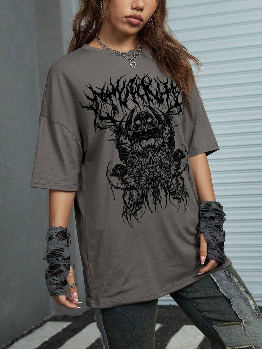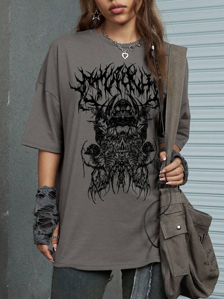 Grunge Punk Camiseta de hombros caídos estampado de cráneo