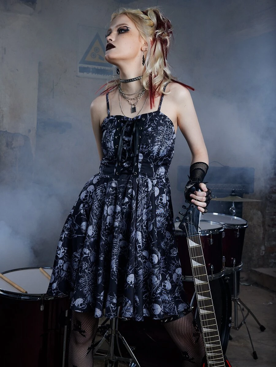 Grunge Punk Vestido de tirantes estampado de cráneo con cordón