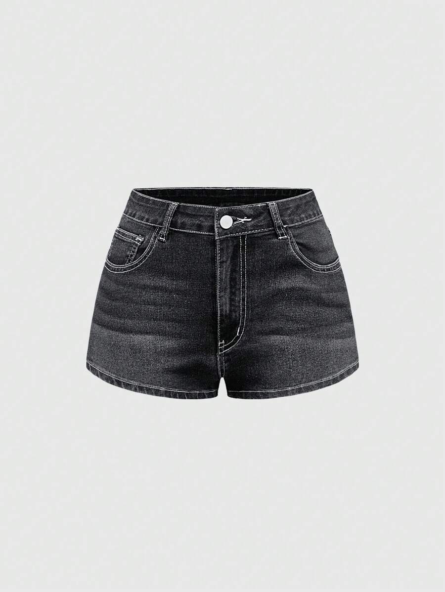 Grunge Punk Pantalones cortos vaqueros ajustados de mujer con estilo vintage Y2K punk, con bolsillos bordados y diseño de alas, color azul marino, con botón, bolsillos, cremallera, cintura baja y pernera acampanada, para uso casual en primavera/otoño