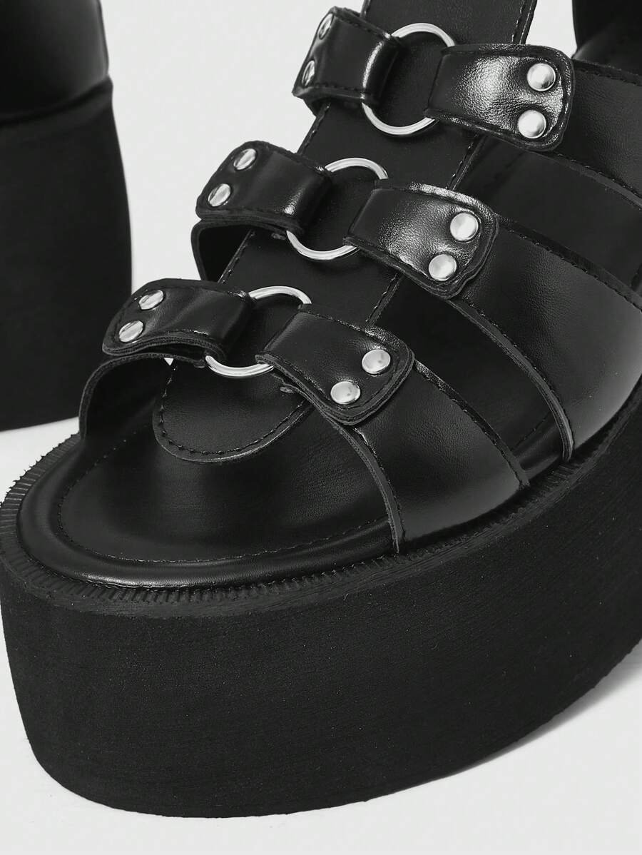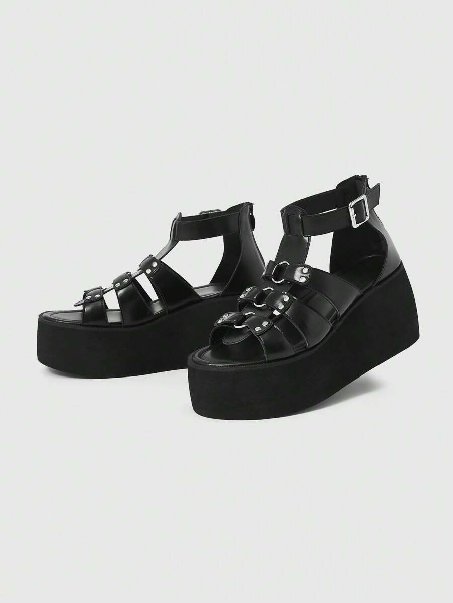 Grunge Punk Sandalias romanas con hebilla para mujer, sandalias romanas con cuña de tacón grueso y punta redonda, material de PU, color negro, adecuadas para fotos de graduación y uso casual