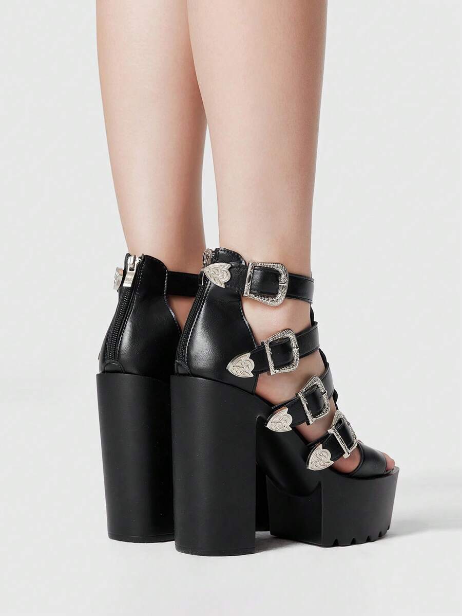 Grunge Punk Sandalias de tacón alto casuales y sencillas con decoración de metal de unicolor para mujeres