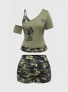 Grunge Punk Conjunto de mujer con estampado de camuflaje, parches, hombro asimétrico y estampado de ojos y letras, en estilo retro grunge Y2K