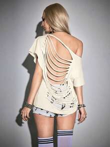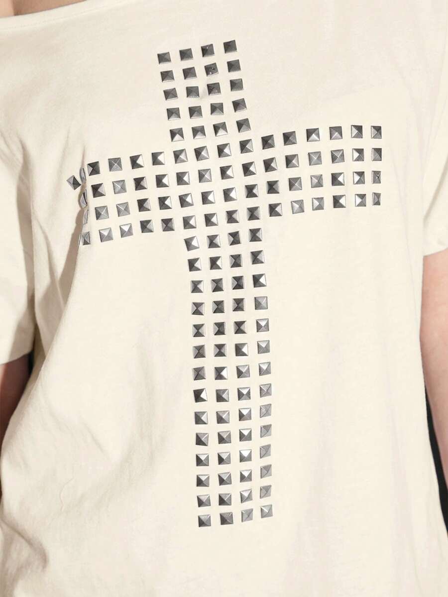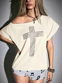 Grunge Punk Camiseta versátil de unicolor con diseño de cruz remachada con láser y corte holgado, estilo punk Y2K