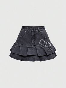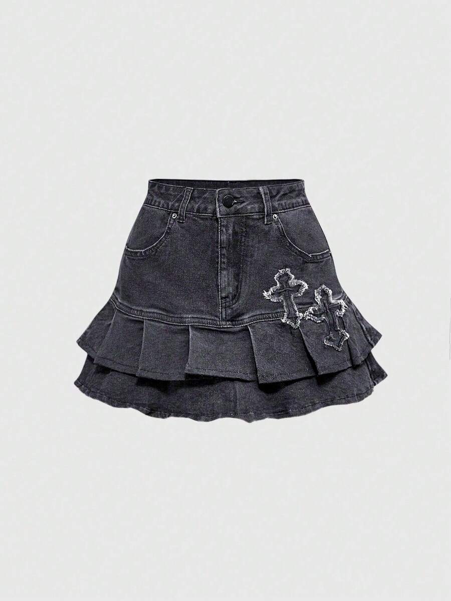 Grunge Punk Falda vaquera negra de línea A con dobladillo deshilachado y bordado cruzado, estilo retro Y2K para festivales de música y vacaciones