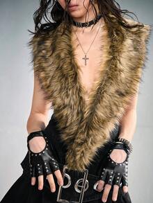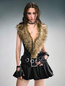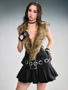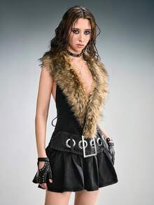 Grunge Punk Vestido de mezclilla con cuello de piel sintética, tirantes, espalda descubierta y ojetes metálicos plisados, estilo Y2K sexy para mujeres
