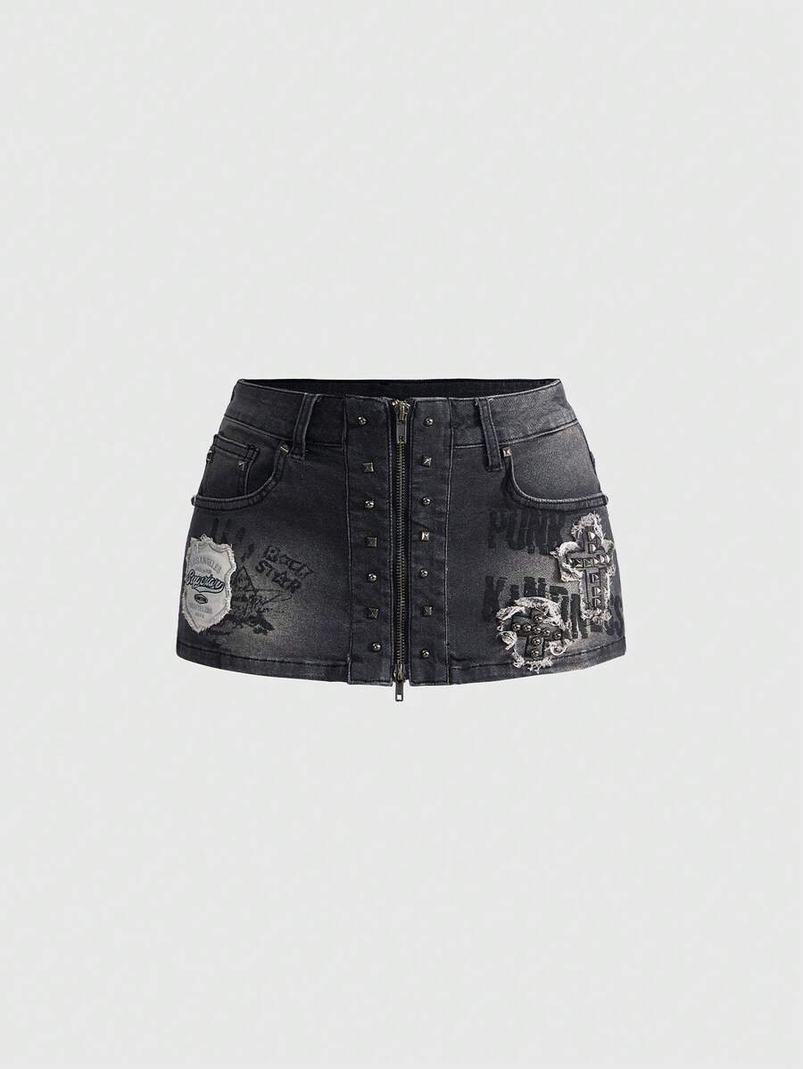 Grunge Punk Shorts vaqueros de mujer con decoración de remaches, bordado de estrellas y estampado de palmas, con efecto vintage desgastado y estilo punk Y2K