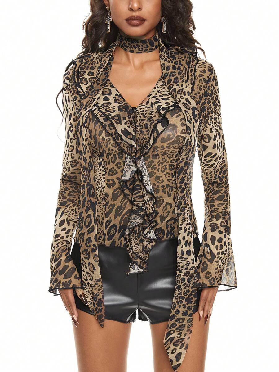 Grunge Punk Blusa ajustada al talle con cuello con volantes y escote en V con estampado de leopardo moderno y sexy para mujeres, estilo Y2K