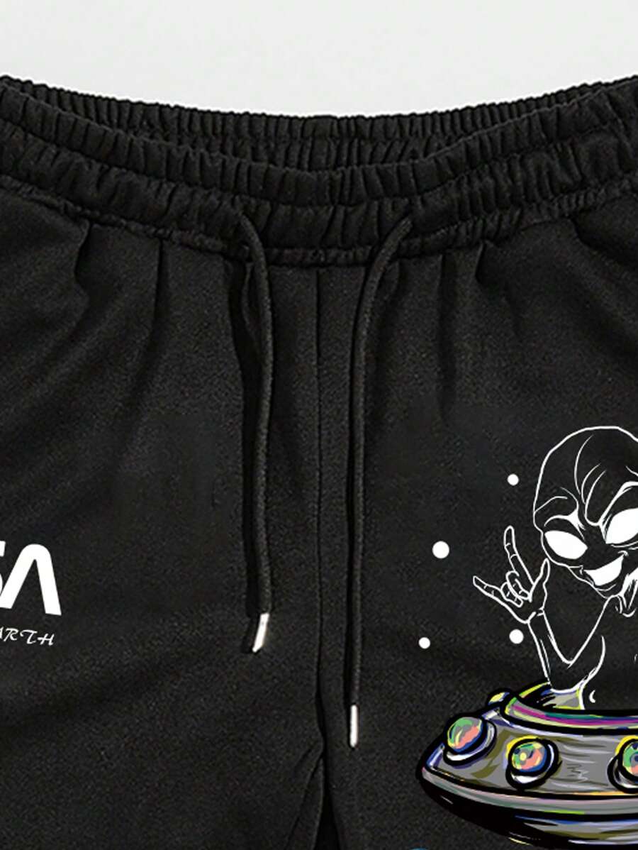 Pantalones De Chándal Para Hombres De Ajuste Holgado Con Gráficos De Extraterrestres Y Letras, Cintura Con Cordón