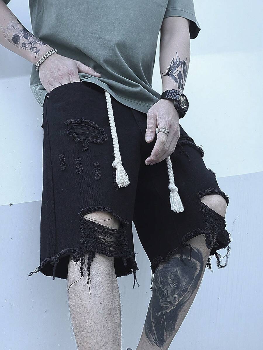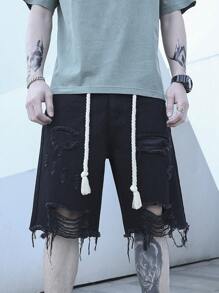 Pantalones Cortos De Mezclilla Rasgados Con Dobladillo De Flecos Y Cintura Con Cordón Para Hombre De Ajuste Holgado