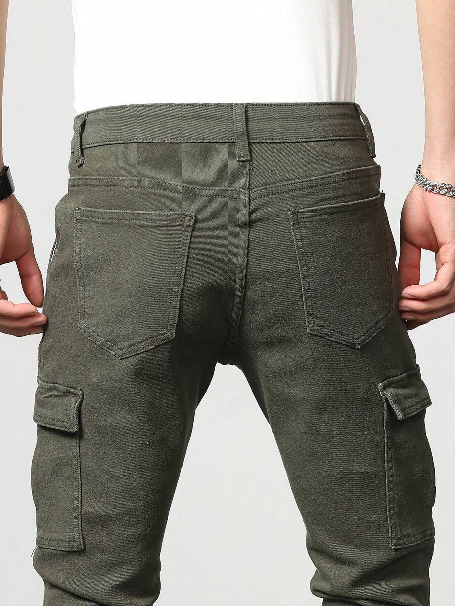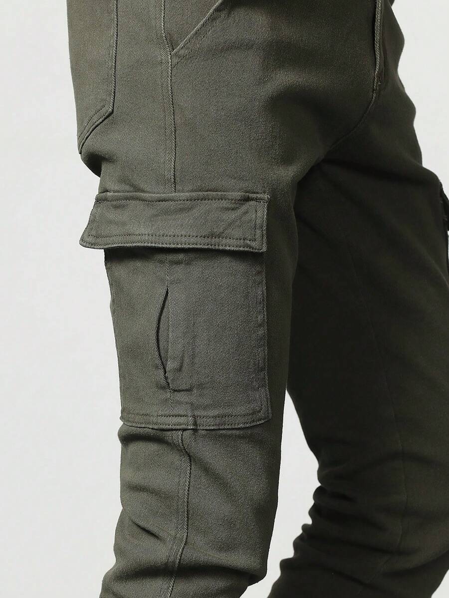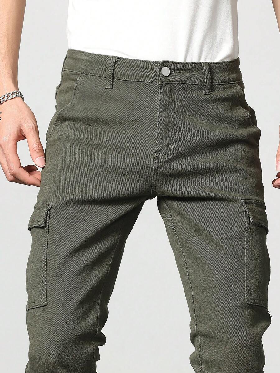 Jeans de carga laterales con bolsillo de solapa de algodón para hombre, corte ajustado, lavado largo oscuro, verde oliva liso, básico de trabajo para esposo