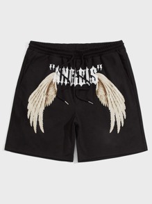 Shorts sueltos con cordón para hombre con patrón impreso de alas de letras y gráficos de animales
