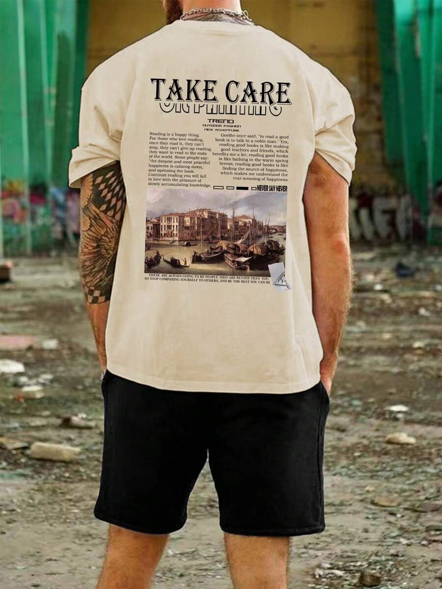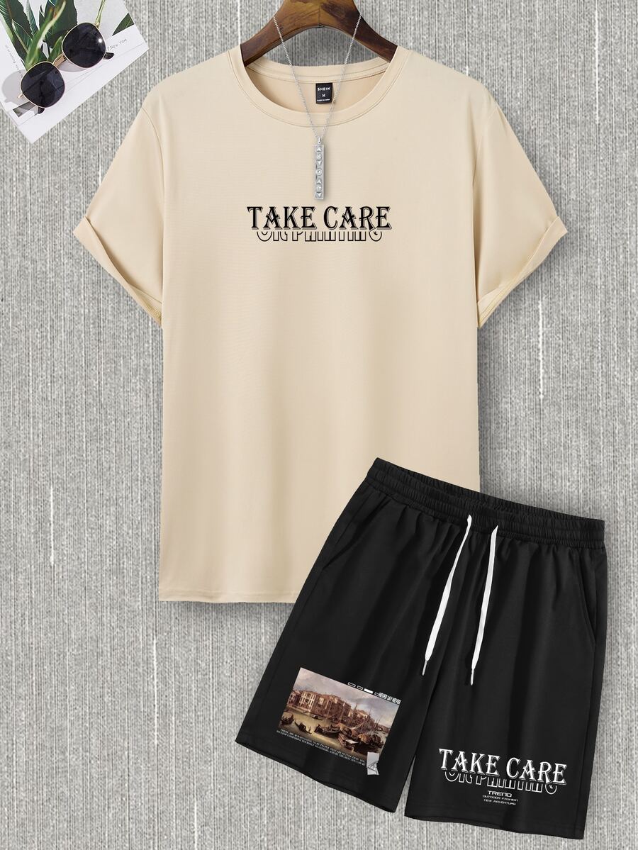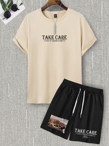 Hombres Camiseta con estampado de slogan & Shorts de cintura con cordón
