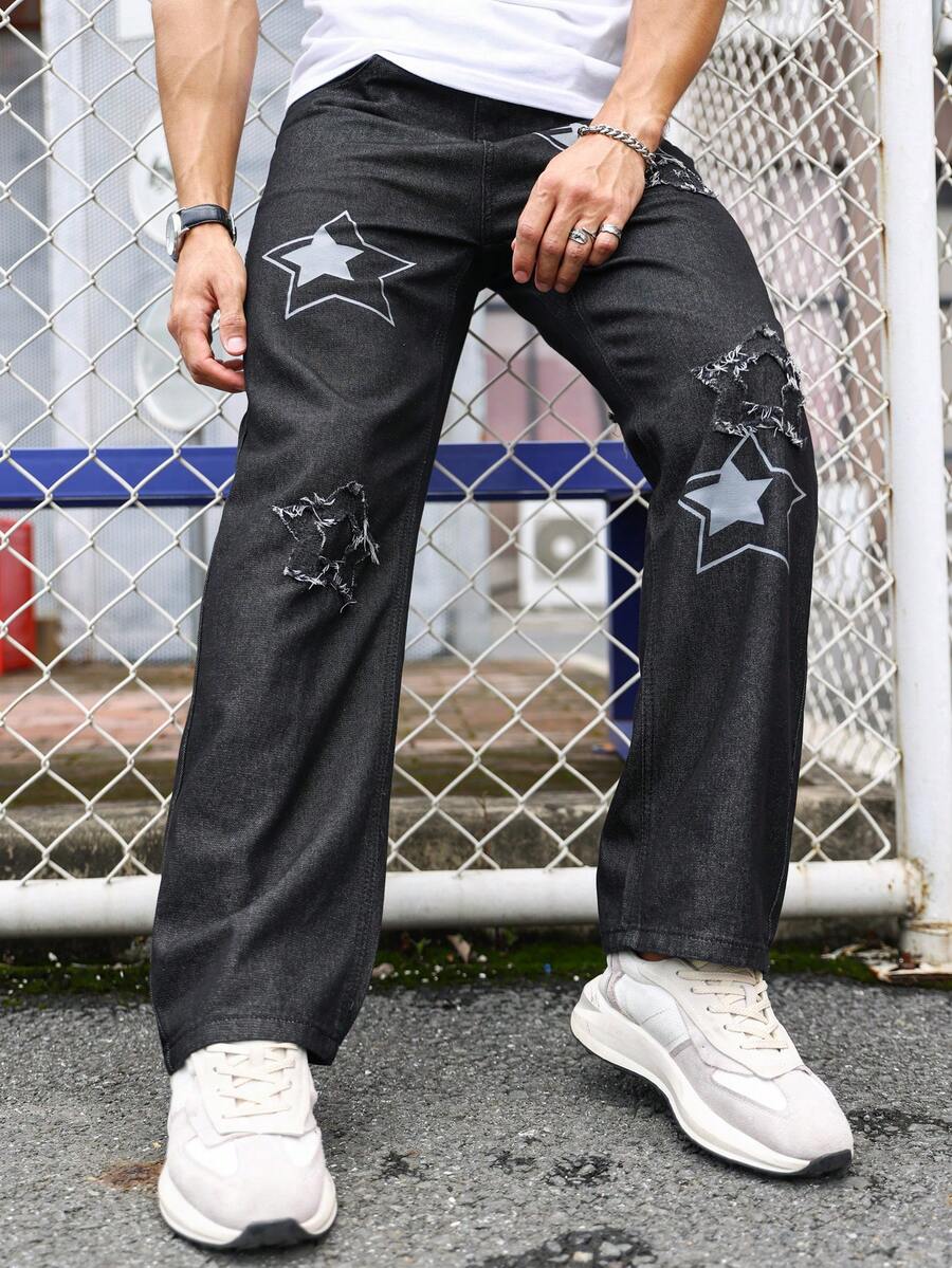 Jeans Para Hombres Sueltos Con Estampado De Estrellas, Pierna Recta Rasgada