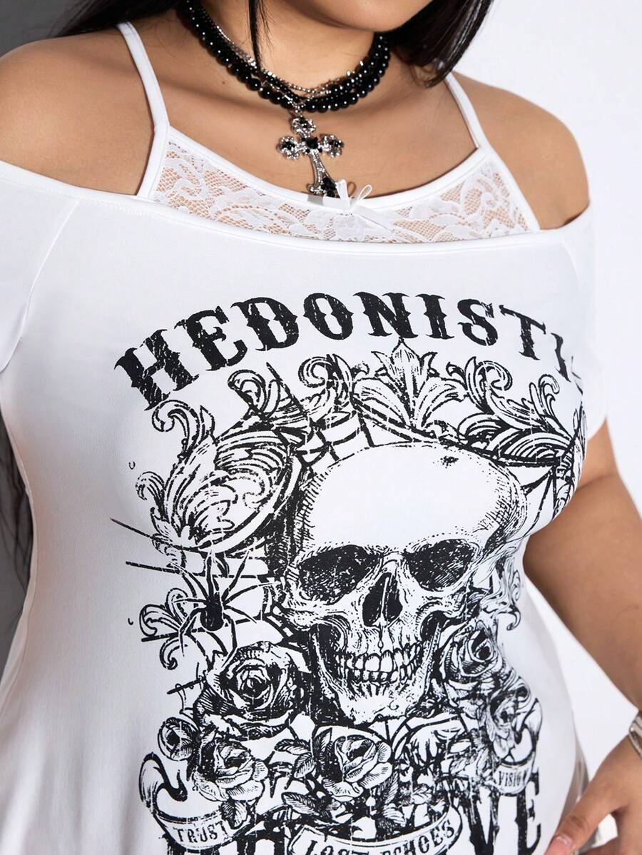 J-Fashion Camiseta asimétrica de hombro con encaje de contraste, estilo gótico, misterioso, con estampado de gato, estrella y calavera, para mujer, estilo streetwear, para festivales, conciertos y playa, talla grande