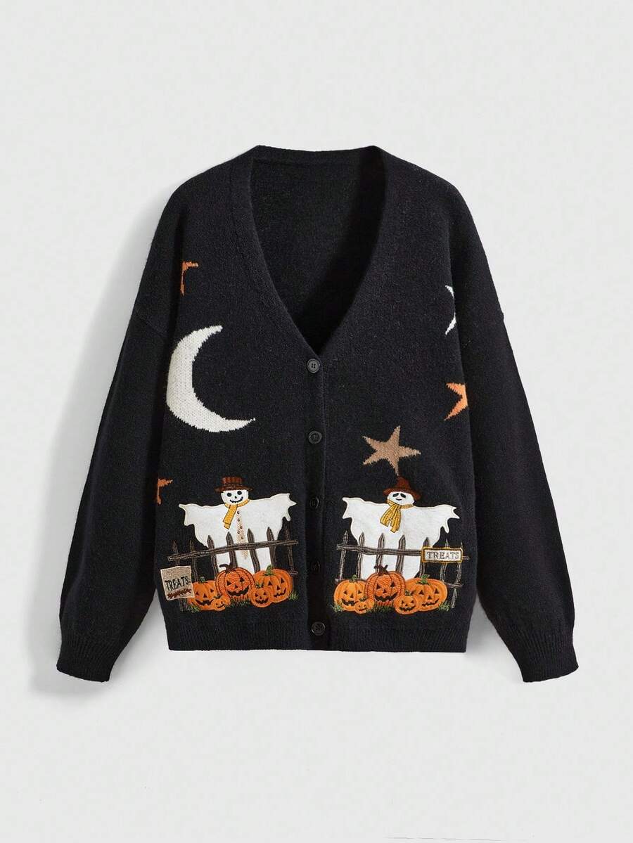 Goth Cárdigan de punto con bordado de calabaza y fantasma, estrellas y luna vintage