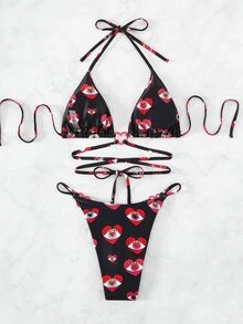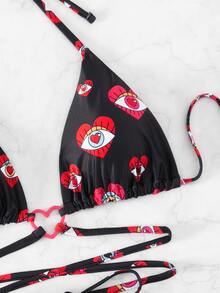 Conjunto de bikini de verano con triángulo de halter y estampado de corazones y ojos para playa
