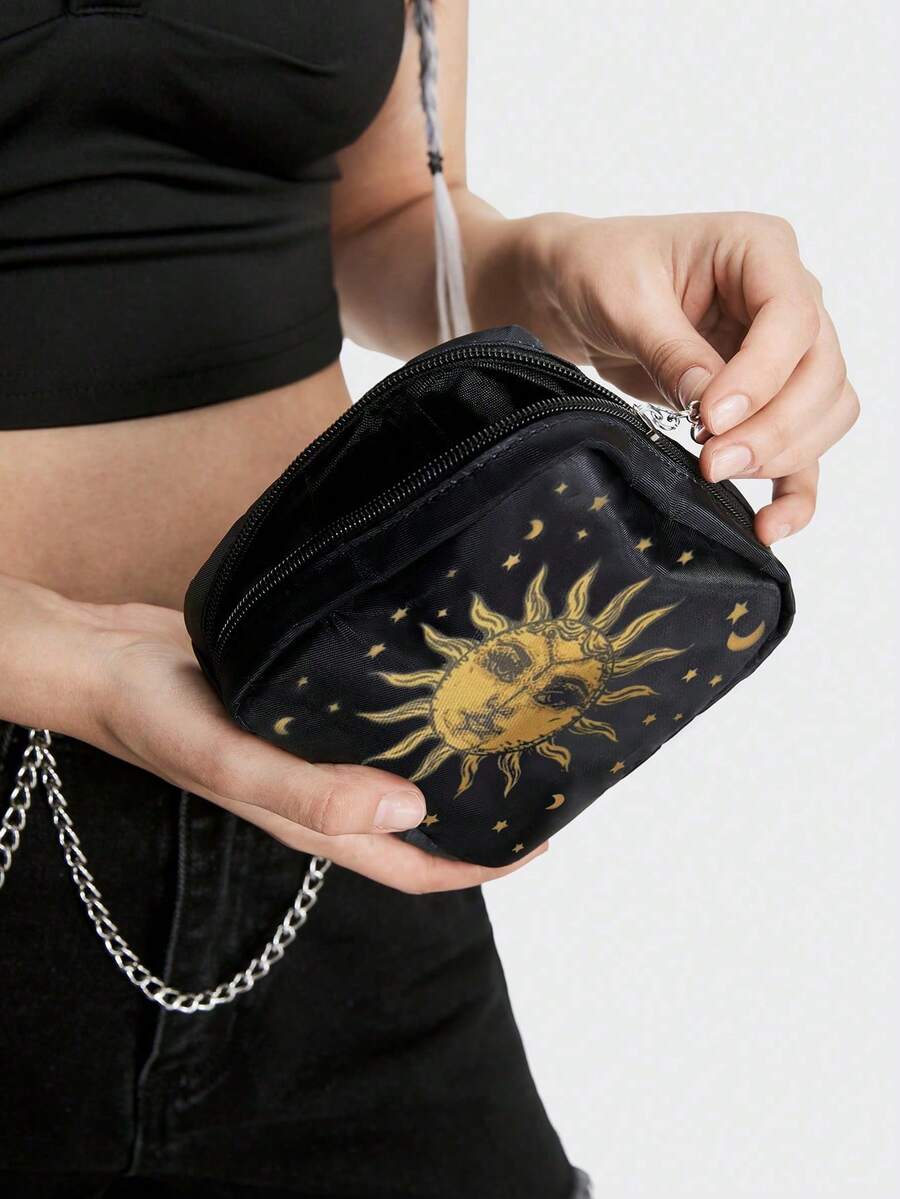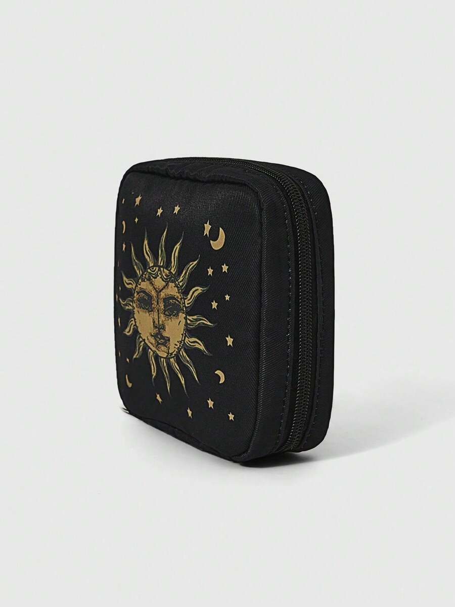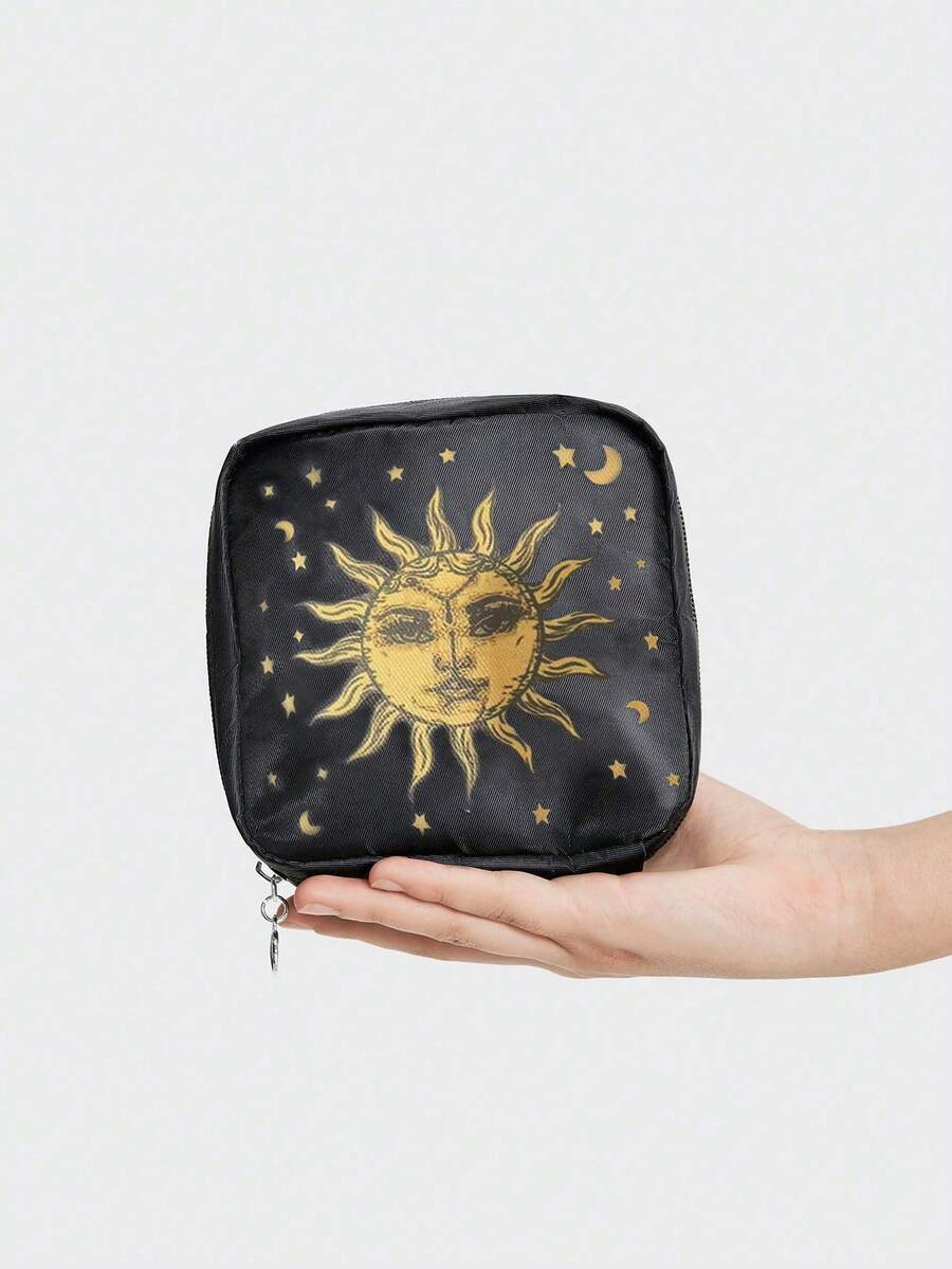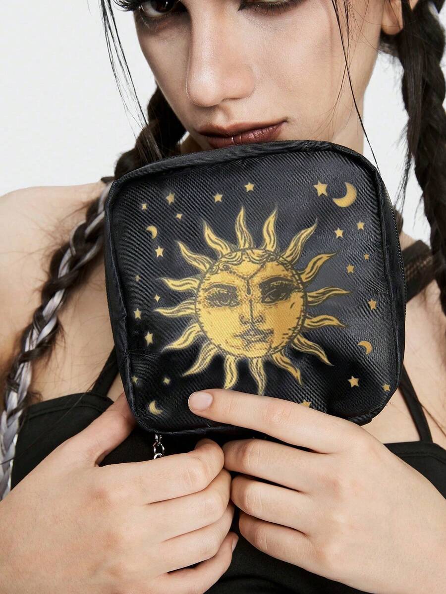 Hippie Bolsa de cosméticos cuadrada con gran capacidad, gruesa y forrada, con diseño de moda con dibujos animados clásicos que presenta al dios sol, estrellas y luna