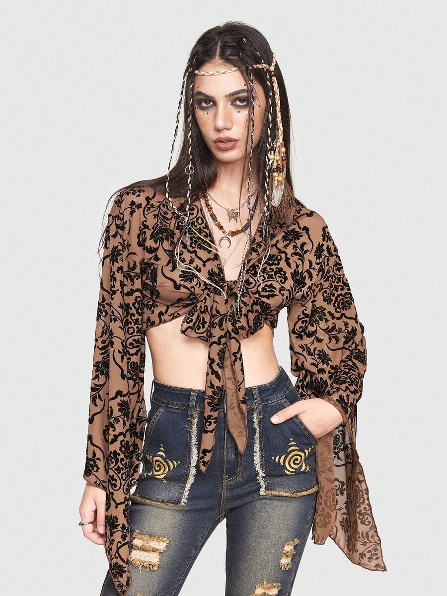 Hippie Top De Manga Acampanada Con Estampado Floral Y Lazo En La Parte Delantera