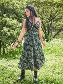 Hippie Vestido de tirantes con estampado de paisley con encaje en contraste