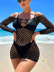 Vestido con abertura de malla de hombros descubiertos ajustado sin set de lencería