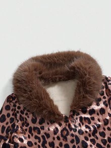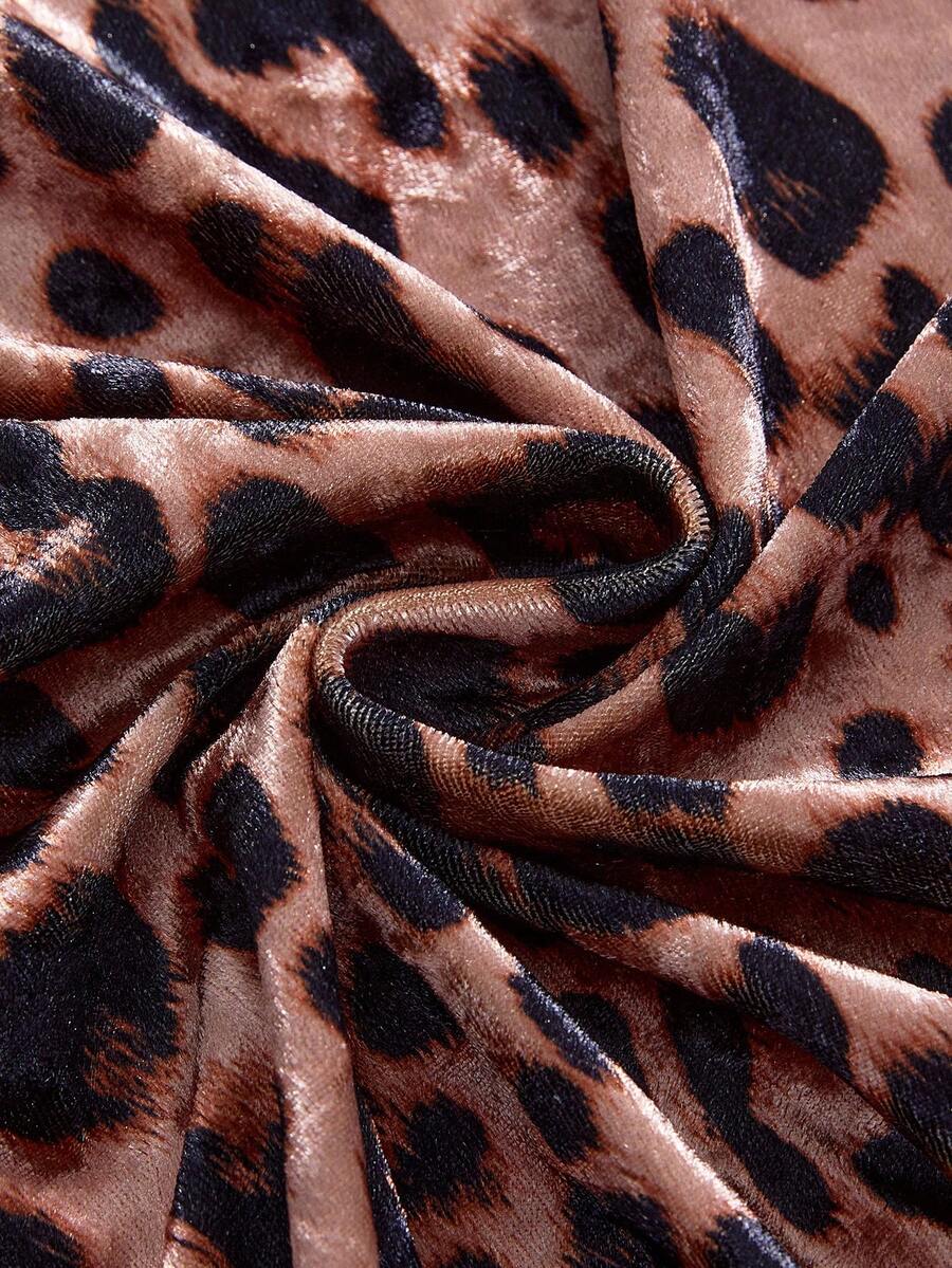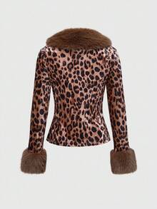 J-Fashion Top ajustado de terciopelo con estampado de leopardo y cuello de piel, para otoño/invierno
