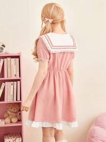 J-Fashion Vestido con lazo delantero cuello marinero bajo con fruncido
