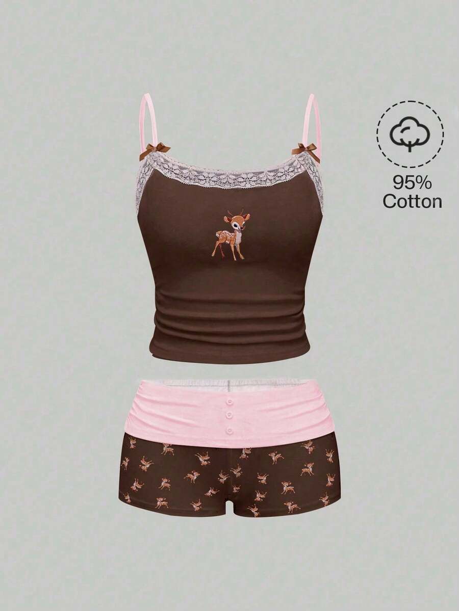 J-Fashion Conjunto de top de camisola con bordado de ciervo lindo y shorts con estampado de ciervo para mujer