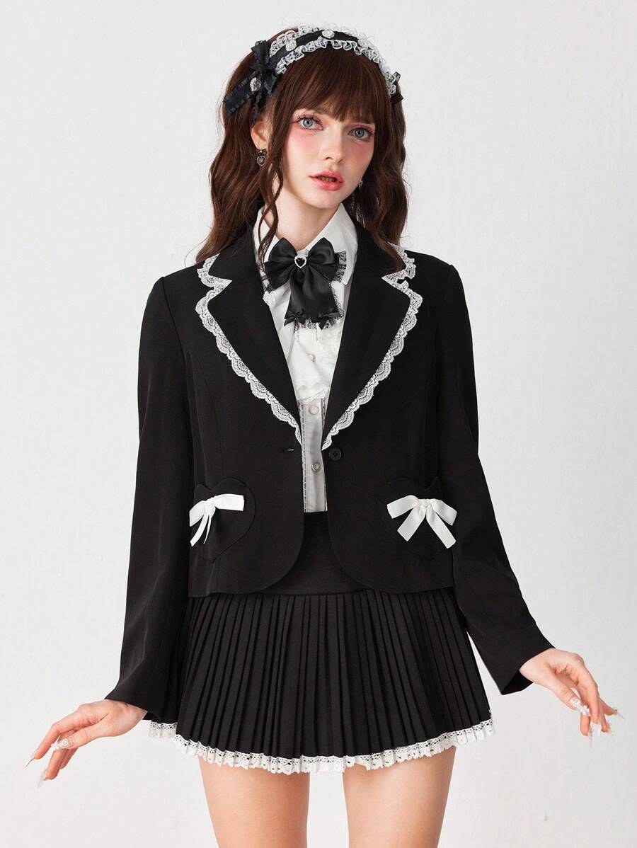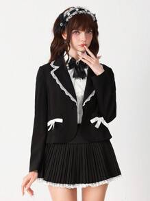 J-Fashion Blazer de moda de manga larga con cuello de lazo y decoración de encaje de contraste para mujer