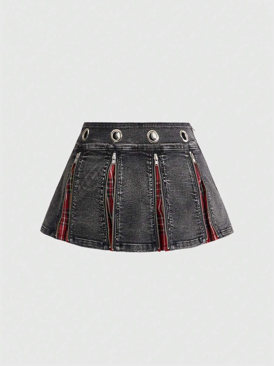 J-Fashion Minifalda de mezclilla sexy de talle súper bajo con estilo universitario retro Y2K, decoración con cremallera y diseño de patchwork