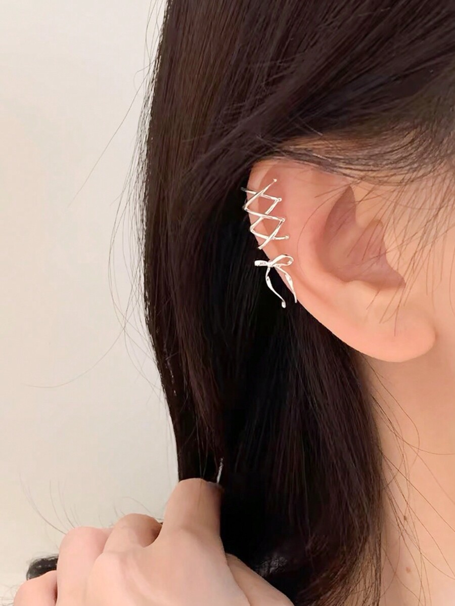 Kawaii 1 par de pendientes de pinza con lazo plateado para el regreso a clases, para el Día de San Valentín