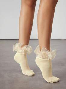 Kawaii 1 par de calcetines medianos reversibles amarillos con borde de encaje floral para mujeres