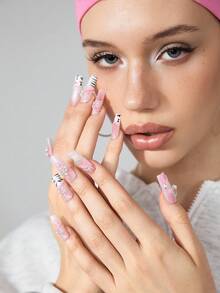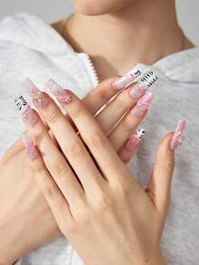 Kawaii 10 piezas de uñas postizas de alta calidad con diseño de color rosa pintado a mano + 3 piezas de adhesivo doble cara, uñas postizas largas en forma de ataúd removibles y reutilizables, pegatinas de uñas decoradas con cristales de color contrastante en estilo "chica caliente", adecuadas para festivales, fiestas, baile y uso diario