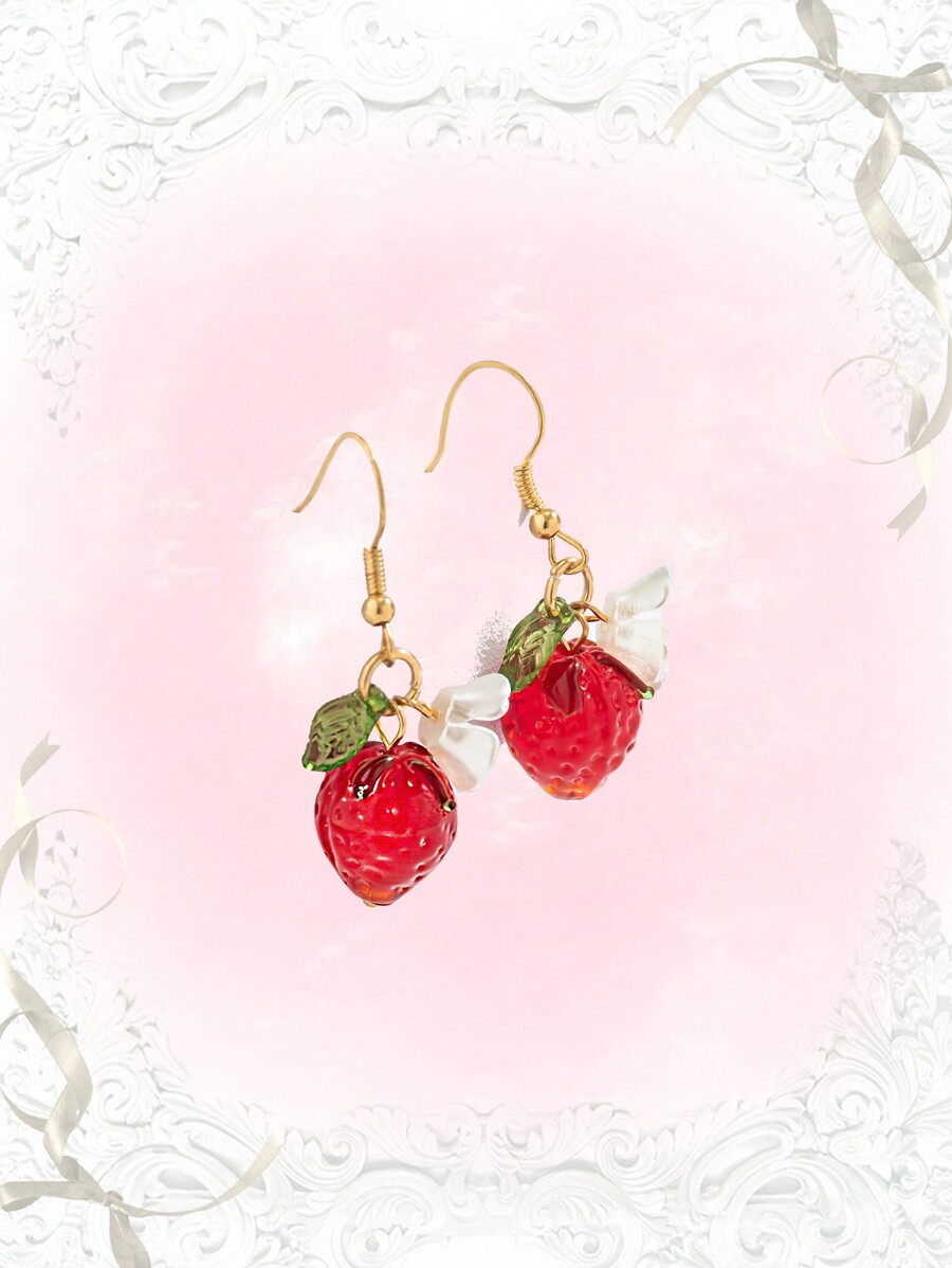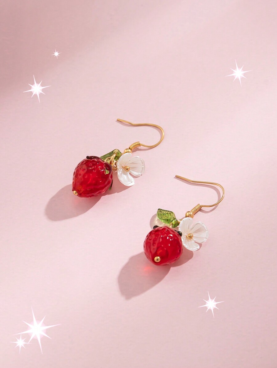 Kawaii 1 Par De Lindos Y Dulces Pendientes De Aros De Fresa Y Perla Falsa Y Flor Colgante De Moda, 2 Piezas