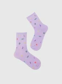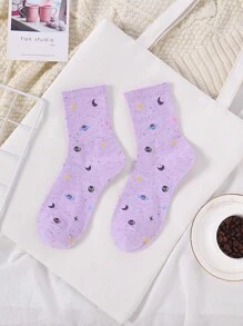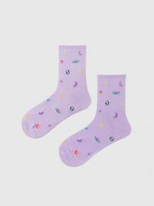 Kawaii 1 Par De Calcetines A Media Pantorrilla De Color Morado Estrellado Lindo Para Mujer