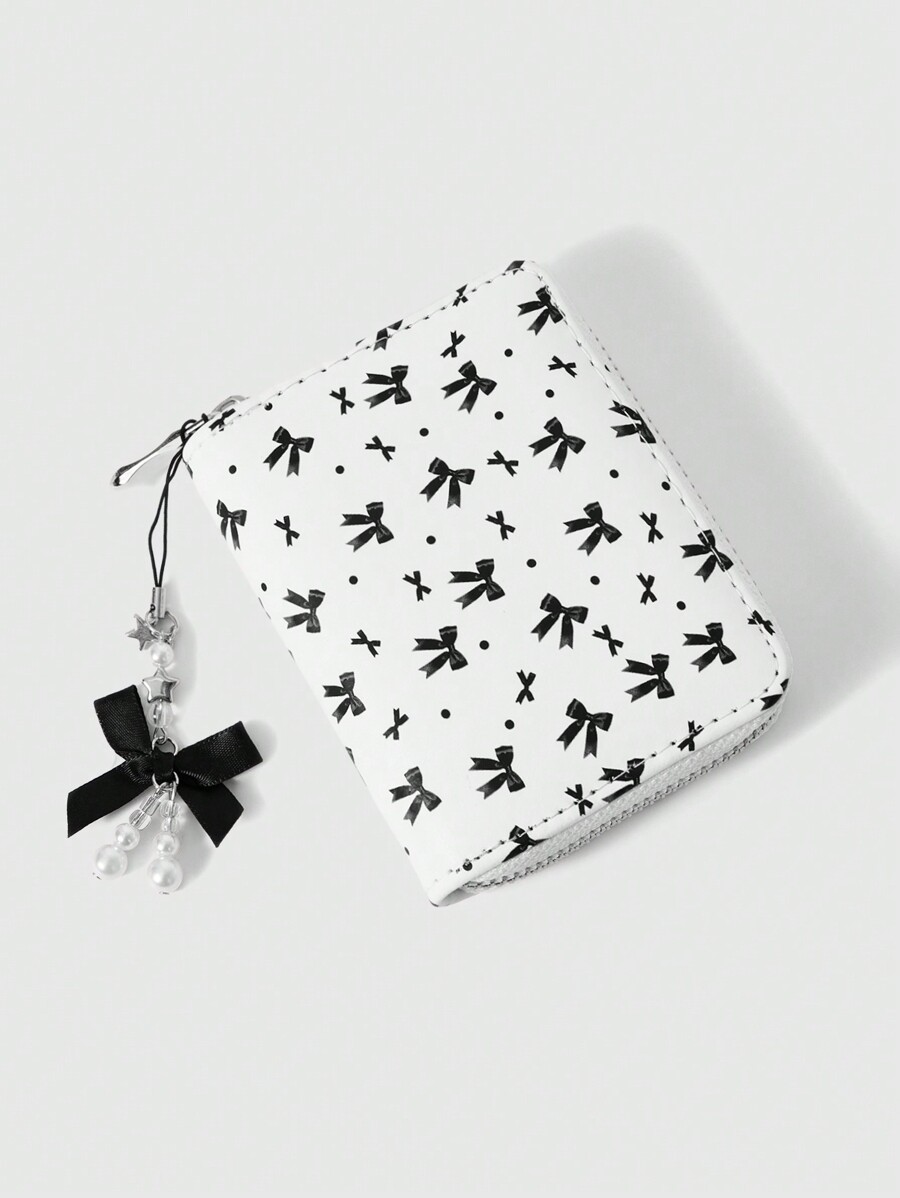 Kawaii 1 pieza Lindo monedero corto con lunares y lazo negro, monedero con cremallera y diseño minimalista de lazo para mujeres