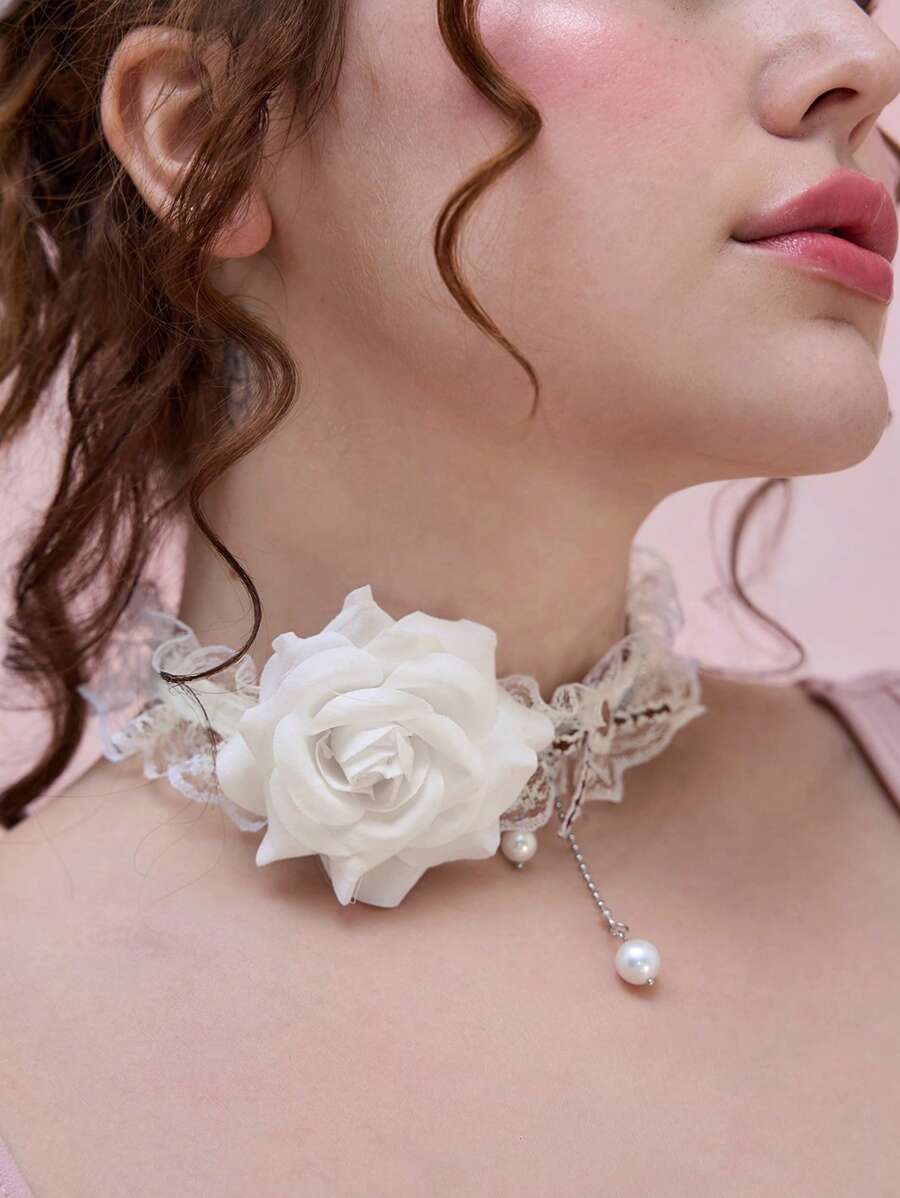 Kawaii 1 pieza Collar gargantilla de estilo palaciego de piel sintética (PU) con colgante de rosa fresca y dulce y perla, accesorio de cuello con encaje de diseño exclusivo