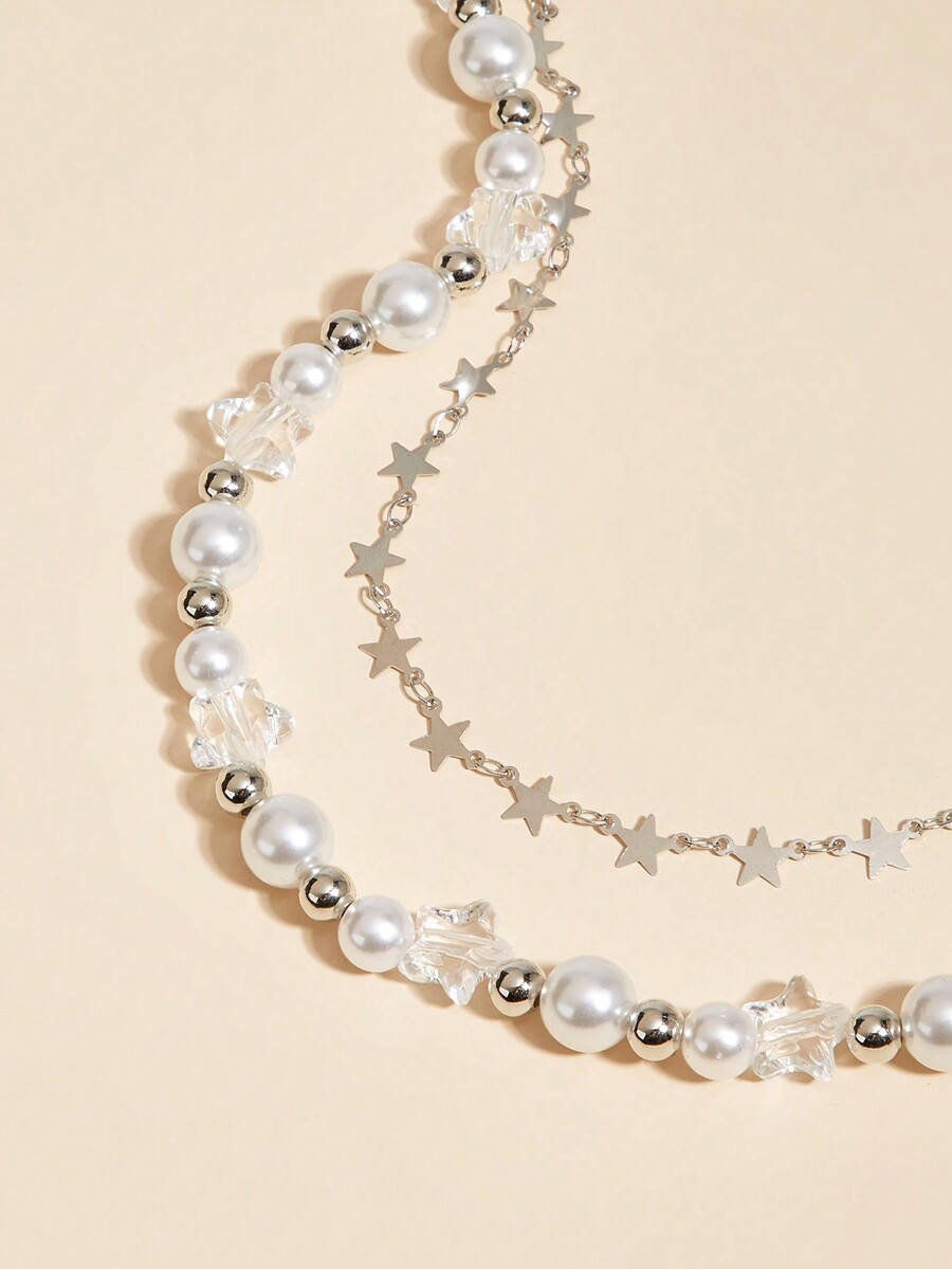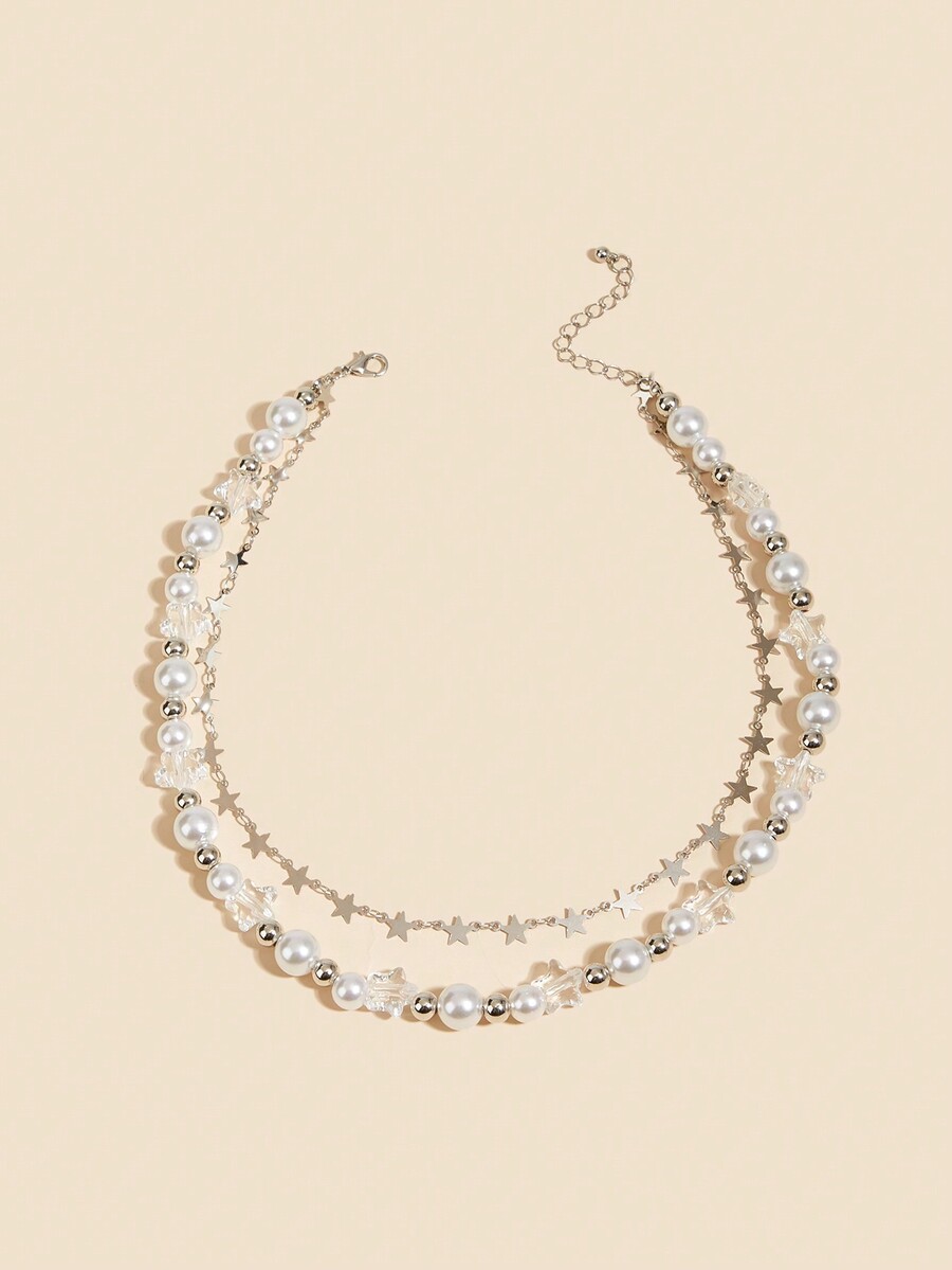 Kawaii 1 Pieza Collar De Capas Minimalista Con Cuentas De Perlas Y Estrellas De Cinco Puntas