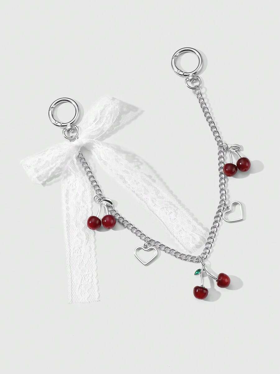 Kawaii 1 pieza Cadena de plata minimalista y elegante estilo Y2K con lazo de red blanca, colgante hueco en forma de corazón y simulación de cereza, accesorio versátil para uso diario, regalo para mujer