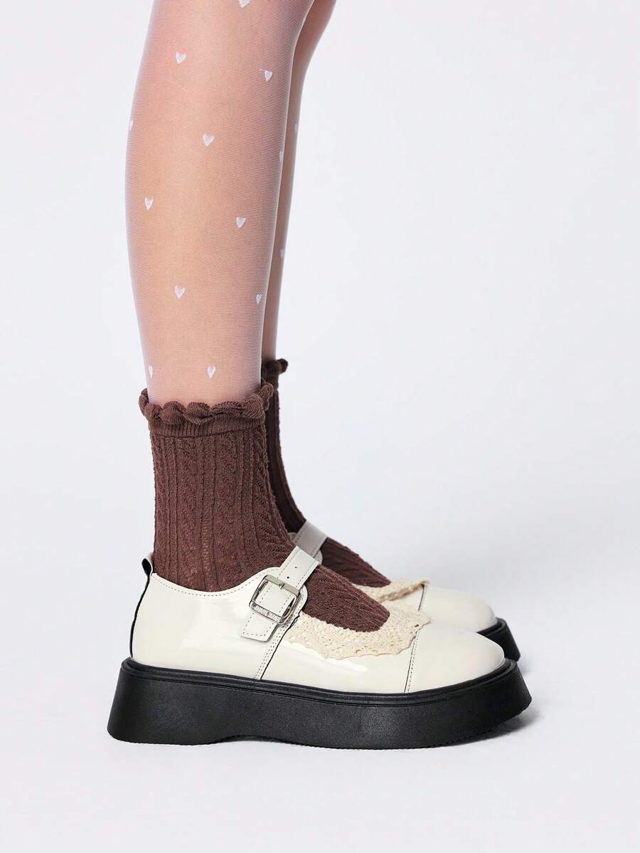 Nuevos zapatos de mujer con llegada en primavera 2025, estilo retro, con ribete de encaje, versátil estilo Kawaii y británico, material de PU, punta redonda, color blanco cremoso