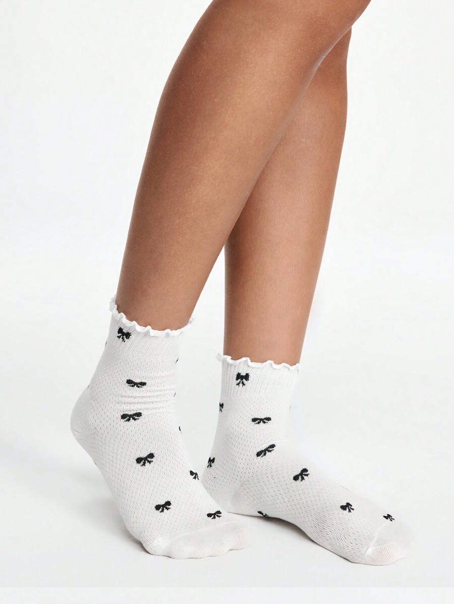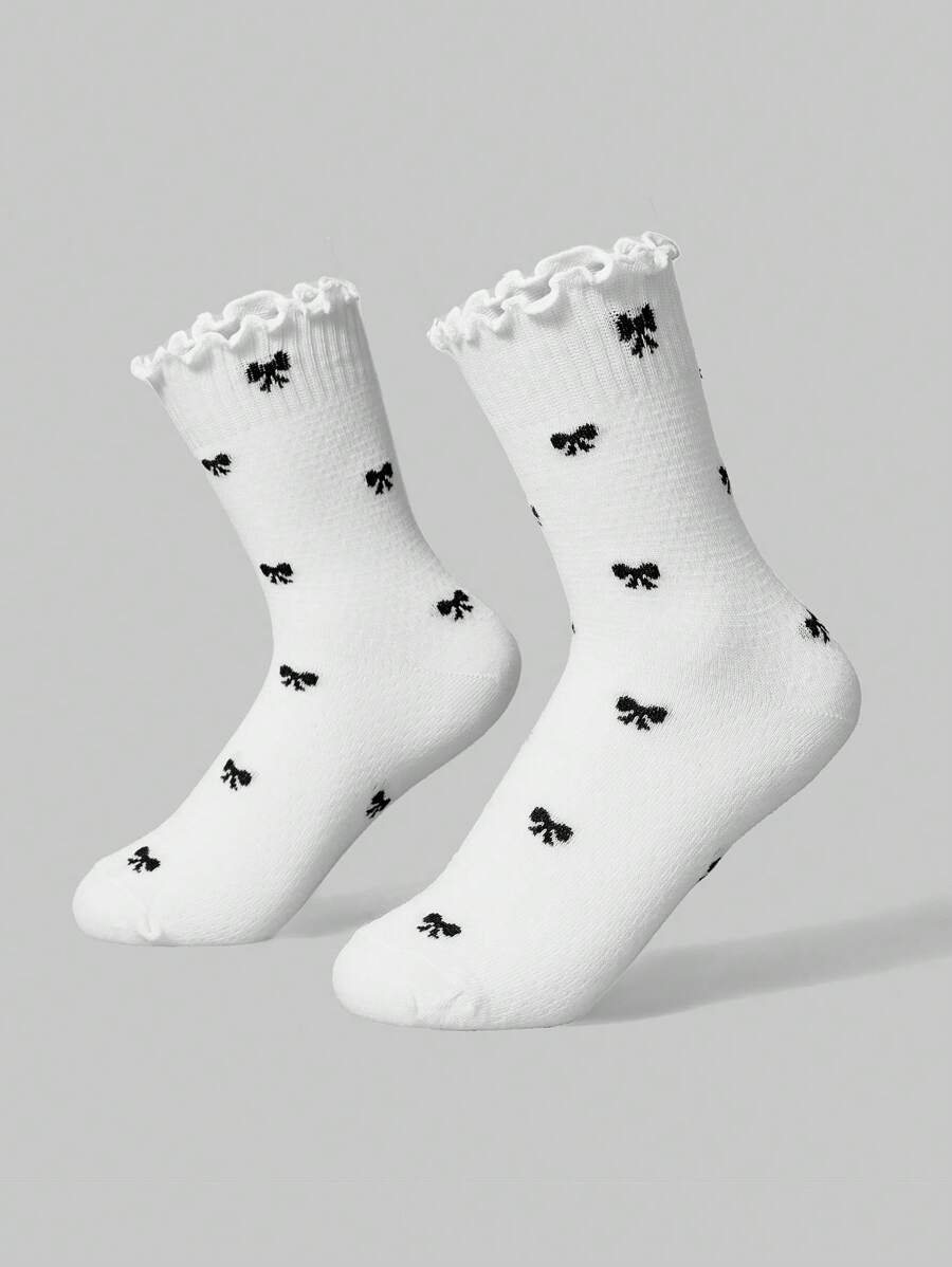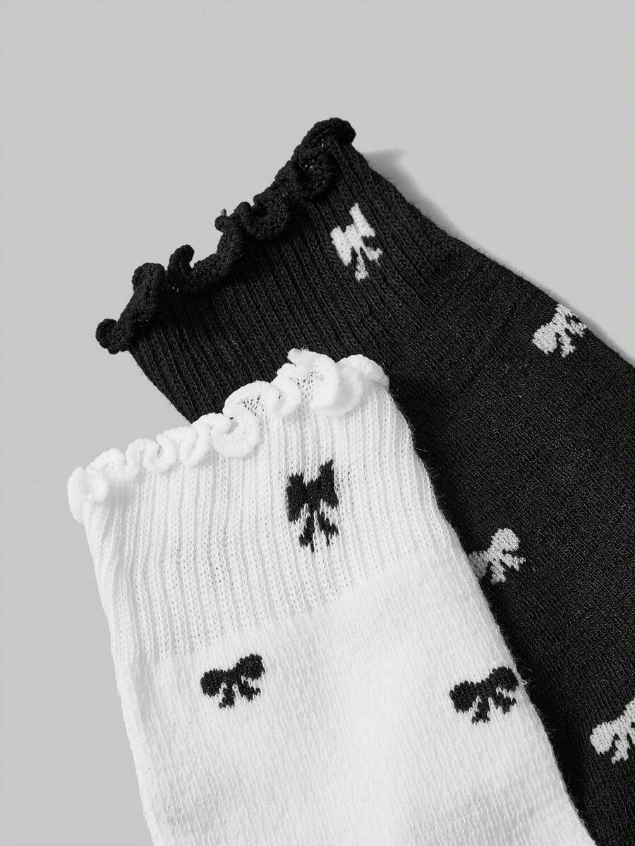 Kawaii 2 pares de calcetines para mujer de media pantorrilla con adorno de lazo y encaje en blanco y negro para todas las estaciones